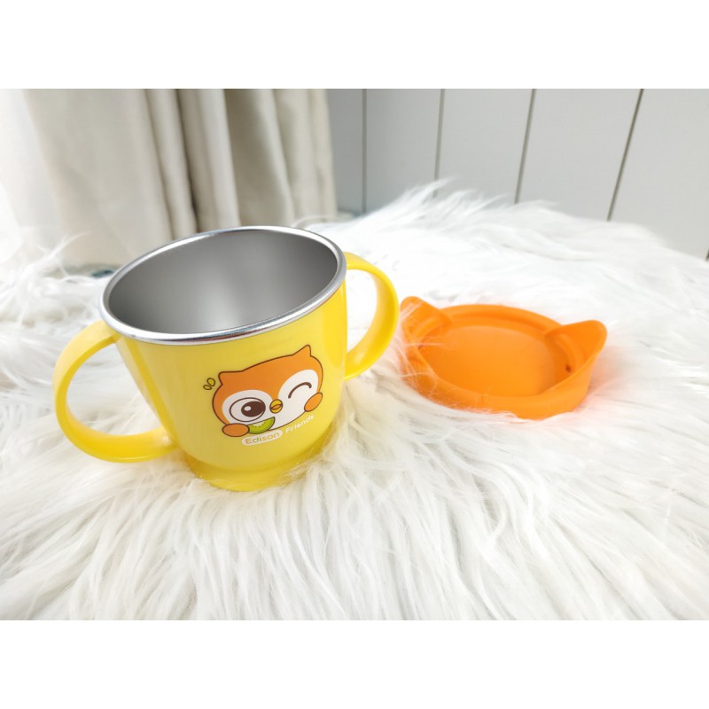 ✨Đồ dùng ăn dặm cho bé MADE IN KOREA -Cốc tập uống Inox 2 lớp có nắp đậy Silicon Edison hình Cú mèo (Quai 2 bên) 5592