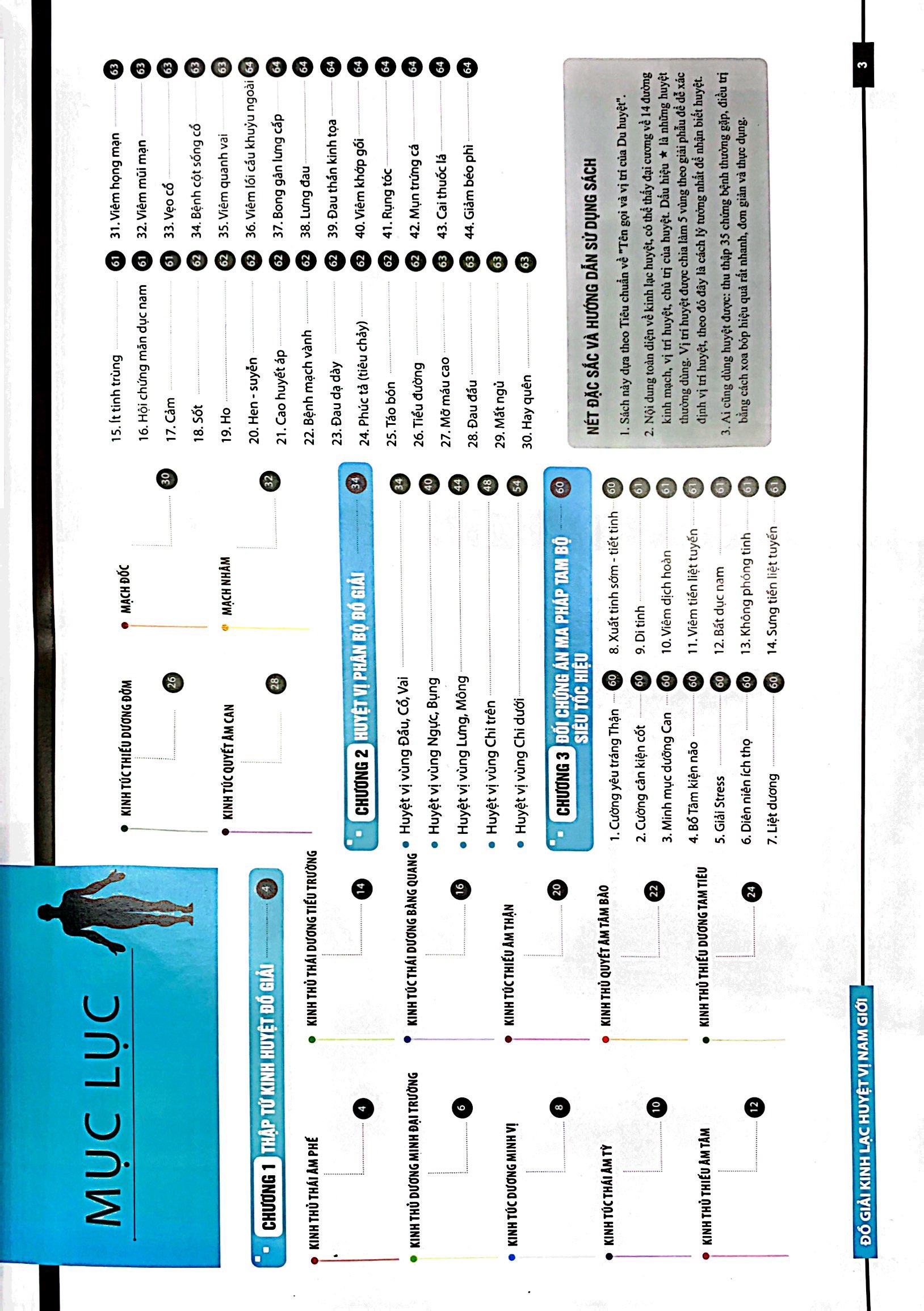 Cuốn sách giới thiệu hệ thống kinh mạch ở nam giới gồm 12 đường kinh chính xếp theo thứ tự tuần hoàn kinh khí. Ngoài ra còn có hệ thống huyệt bên ngoài đường kinh: