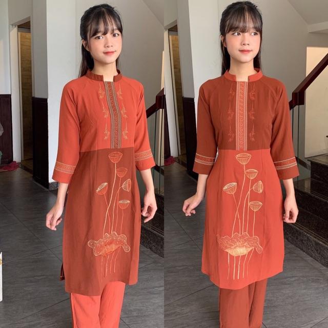 Đồ bộ đi chùa vải đủi vân may thêu hoa sen và chữ AN