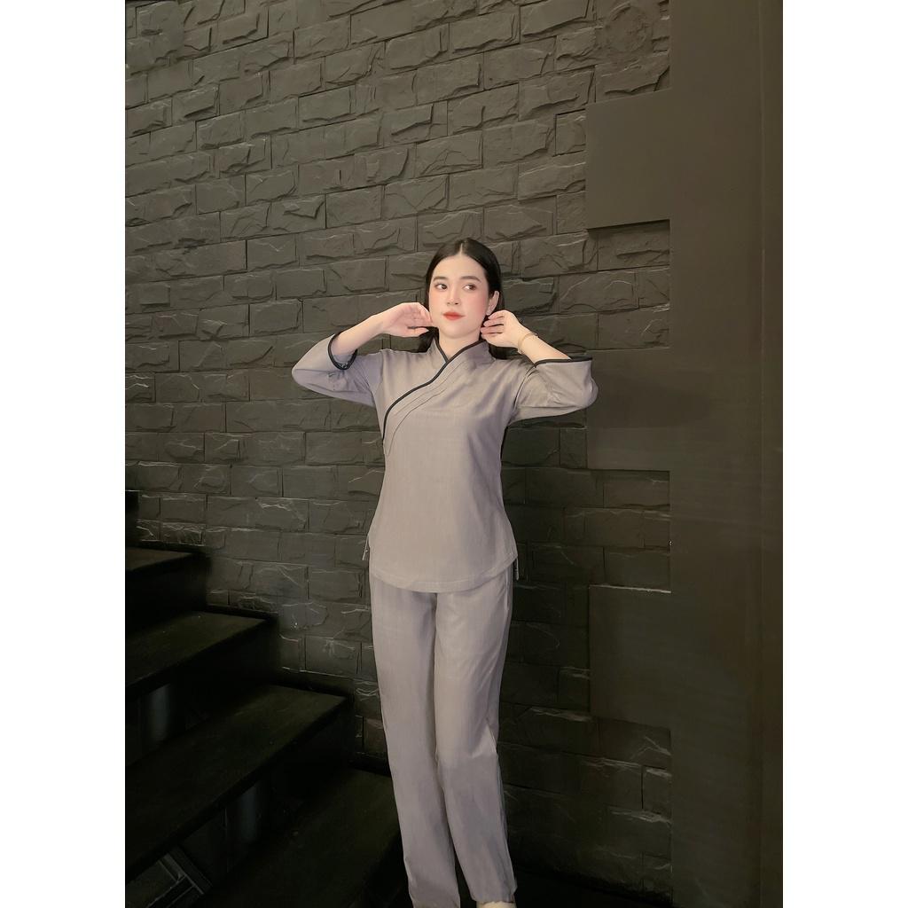quần áo Phật tử cổ tàu cài chéo - đồ lam đi chùa Sen Hồng - set Phật tử nữ đẹp 0898553583