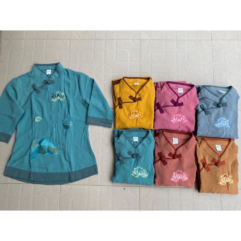 SIÊU PHẨM pháp phục nữ vải đũi lụa thêu sen cao cấp - quần áo lam đi lễ chùa chính hãng SEN HỒNG