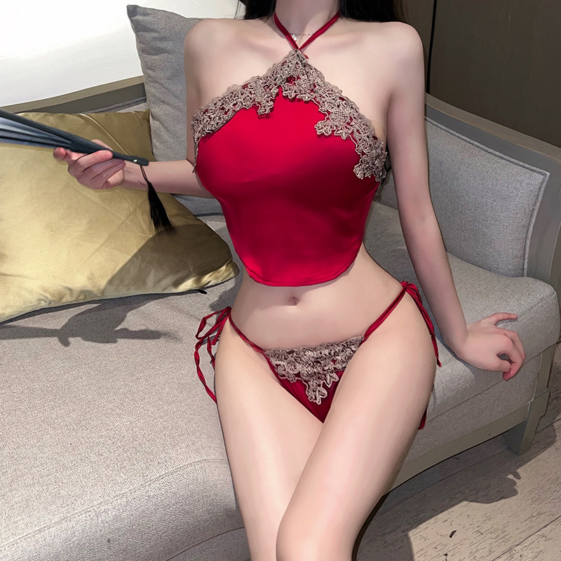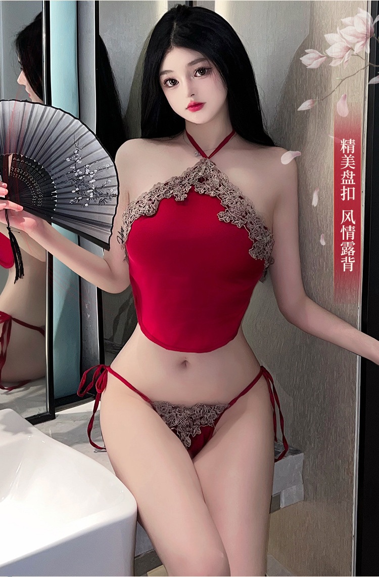 Sản phẩm là sự pha trộn hoàn hảo giữa vẻ đẹp cổ điển Trung Hoa với đường nét thiết kế hiện đại. Áo yếm cổ buộc dây tạo hình trái tim, viền ren hoa tinh tế mang lại cảm giác nhẹ nhàng, nữ tính nhưng cực kỳ quyến rũ.