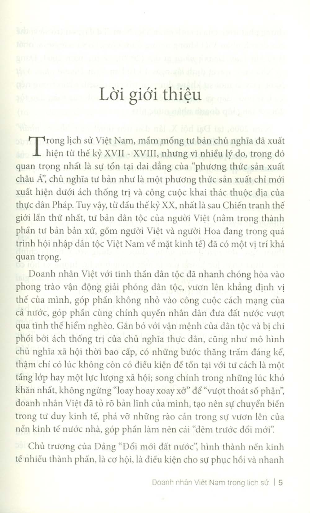 Điều đáng lưu ý là cuốn sách này không tiếp cận và đi sâu vào vấn đề giai cấp xã hội mà chủ yếu xem xét ở góc độ cấu trúc nền kinh tế, thành phần kinh tế, sự chuyển biến của nền kinh tế đất nước cùng với sự hình thành và phát triển của doanh nhân Việt Nam. Cuốn sách được kết cấu thành 7 chương trải dài thành câu chuyện kể liền mạch: Từ thương nhân đến doanh nhân - Một vài khái niệm, Thương nhân Việt Nam trước khi thực dân Pháp xâm lược, Doanh nhân Việt Nam từ giữa thế kỷ XIX đến năm 1945, Doanh nhân Việt Nam giai đoạn 1945 – 1954, Doanh nhân Việt Nam giai đoạn 1954 – 1975, Doanh nhân Việt Nam giai đoạn từ năm 1975 đến đầu thế kỷ XXI, Doanh nhân Việt Nam - Hành trang tiếp bước.