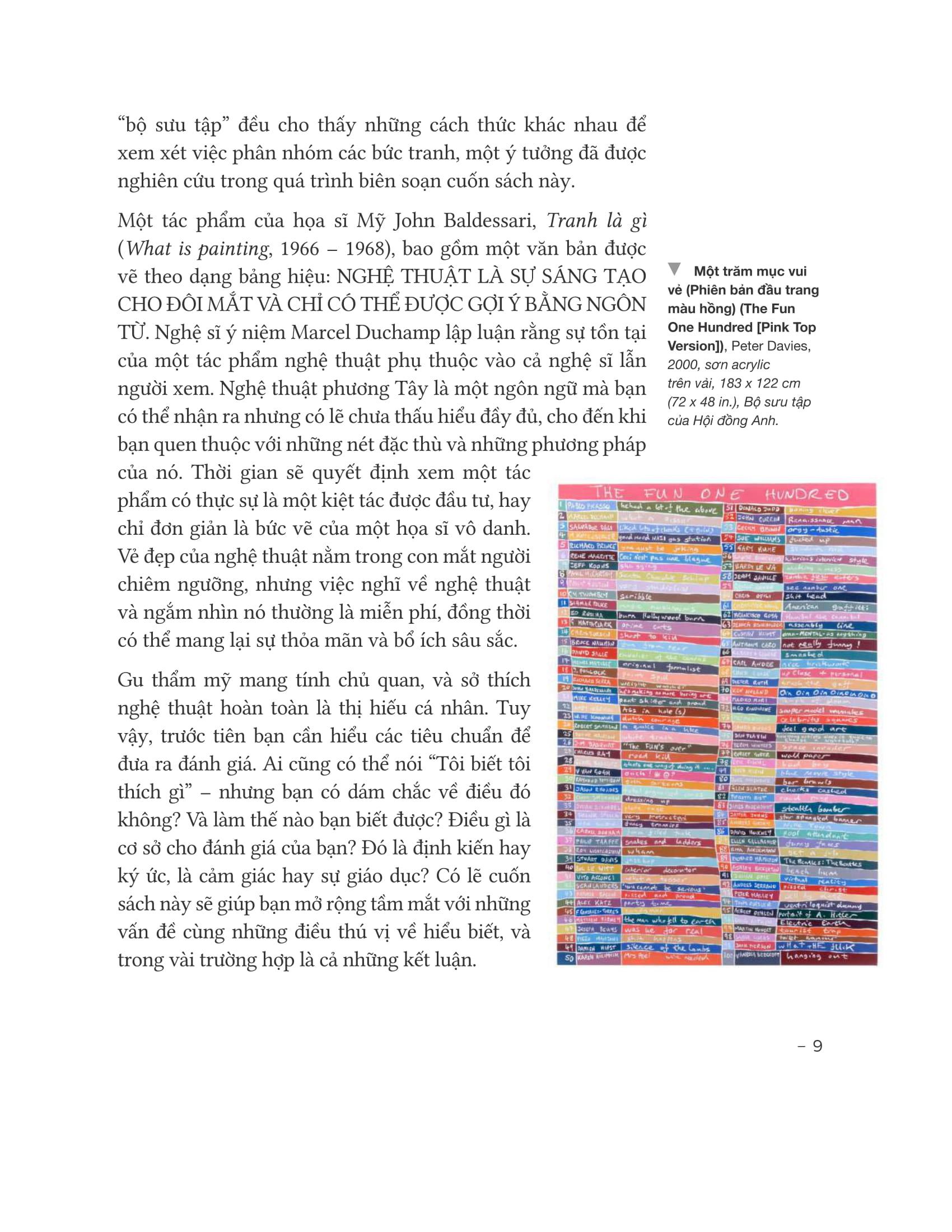 Trang 9: “Gu thẩm mỹ mang tính chủ quan, và sở thích nghệ thuật hoàn toàn là thị hiếu cá nhân. Tuy vậy, trước tiên bạn cần hiểu các tiêu chuẩn để đưa ra đánh giá. Ai cũng có thể nói “Tôi biết tôi thích gì” – nhưng bạn có dám chắc về điều đó không? Và làm thế nào bạn biết được? Điều gì là cơ sở cho đánh giá của bạn? Đó là định kiến hay ký ức, là cảm giác hay sự giáo dục?”