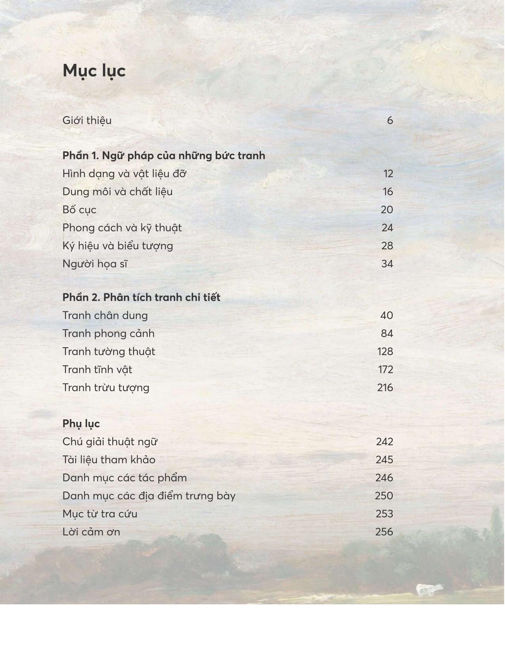 Ngữ pháp của những bức tranh: Phân tích năm yếu tố cấu thành tác phẩm, bao gồm: hình dạng và vật liệu đỡ, dung môi và chất liệu, bố cục, phong cách và kỹ thuật, ký hiệu và biểu tượng. Đồng thời trong phần này còn có một mục phân tích về người họa sĩ – cá nhân sáng tạo ra tác phẩm.