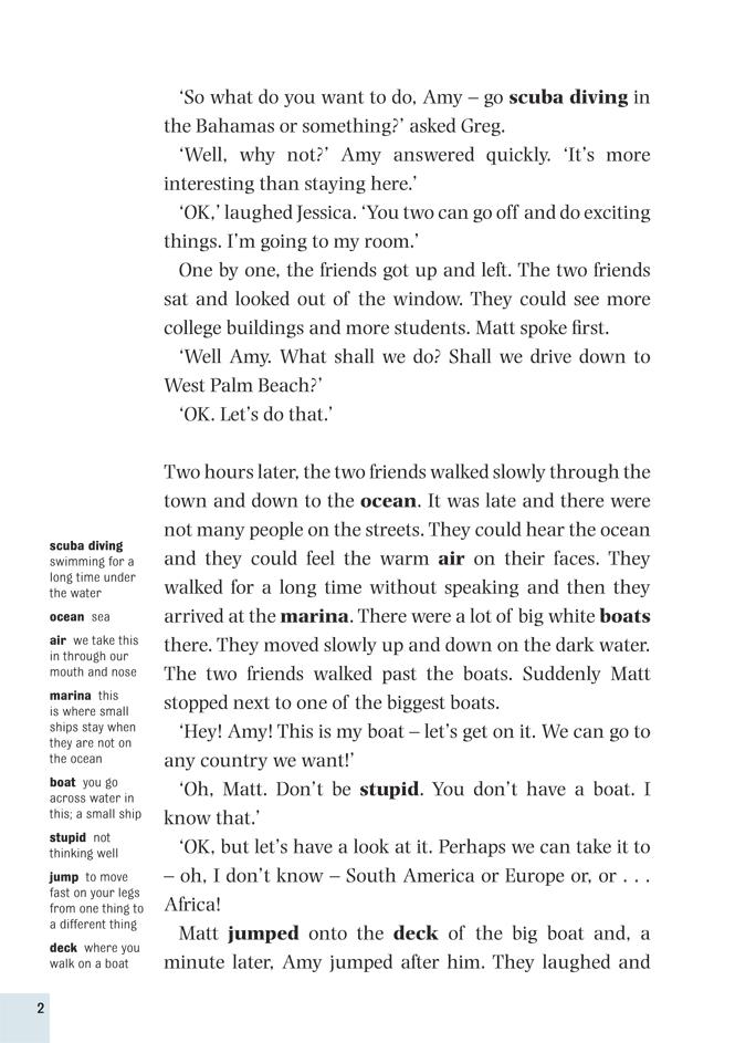 Amy and Matt are bored. They don't want to study for their exams they want to have a good time. So they drive to the marina at West Palm Beach, and Matt jumps onto one of the boats. 'We can go anywhere!' he jokes. But when the owners of the boat come back and find them, Amy and Matt are in deep trouble. Matt is a good swimmer and enjoys scuba-diving, but now he must dive for their lives.