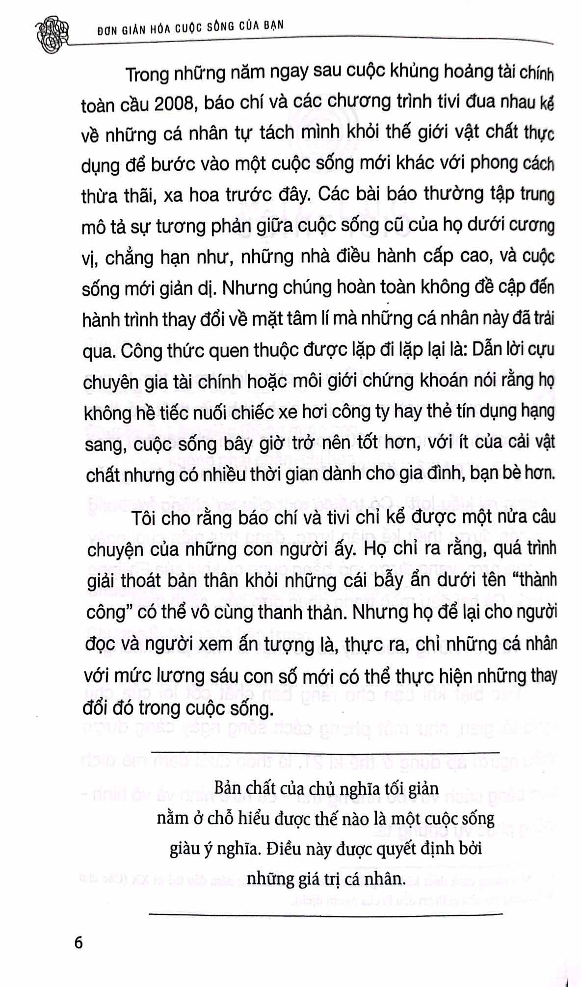 Tác giả muốn chúng ta cũng được “giải thoát” như cô, để trả lời được những câu hỏi: Bạn muốn phát triển mặt nào của đời sống? Bạn muốn thực hiện giấc mơ nào, hoàn thiện tài năng nào? Đó có thể là vẽ một bức tranh, viết một cuốn tiểu thuyết, có cuộc sống gia đình viên mãn hay đạt được sự độc lập về tài chính. Dù mục tiêu là gì, hãy nhớ “tối giản là một lối sống cho phép chúng ta thoát ra khỏi mớ bòng bong ngăn cản ta đạt được mục đích cuộc đời.”