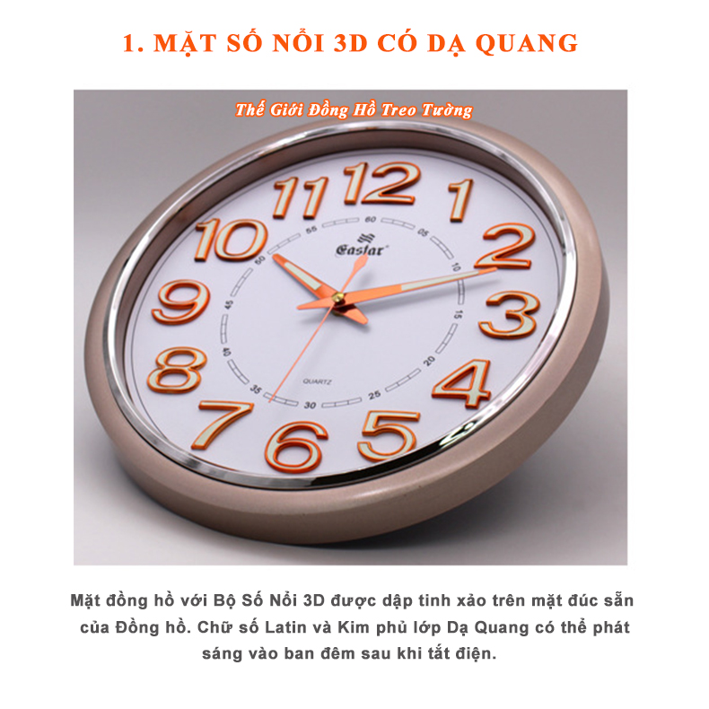 1. ĐẶC ĐIỂM NỔI BẬT: - Đồng hồ Treo tường Cao Cấp EASTAR có Dạ quang (*), máy đồng hồ Kim trôi mặt tròn Thương hiệu Gastar, đường kính 34 cm, dày 4,5 cm. -