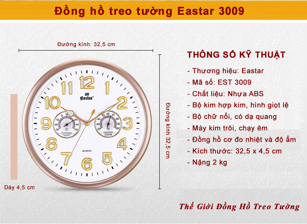 1. ĐẶC ĐIỂM NỔI BẬT: - Đồng hồ Cao Cấp EASTAR kiểu dáng hiện đại với đường kính lên tới 32,5 cm, dày 4,5 cm. - Bộ Kim và số nổi 3D có Dạ Quang