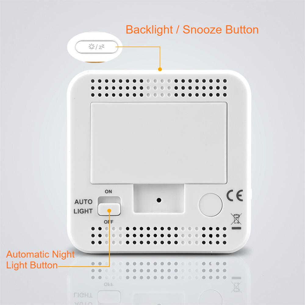 Features: Indoor temperature and humidity, and the temperature is in C/F units selectable. 12h/24h display format switchable. 2.8 LCD screen to display time, date, week, temperature and humidity clearly. Dual alarm clock and snooze function.