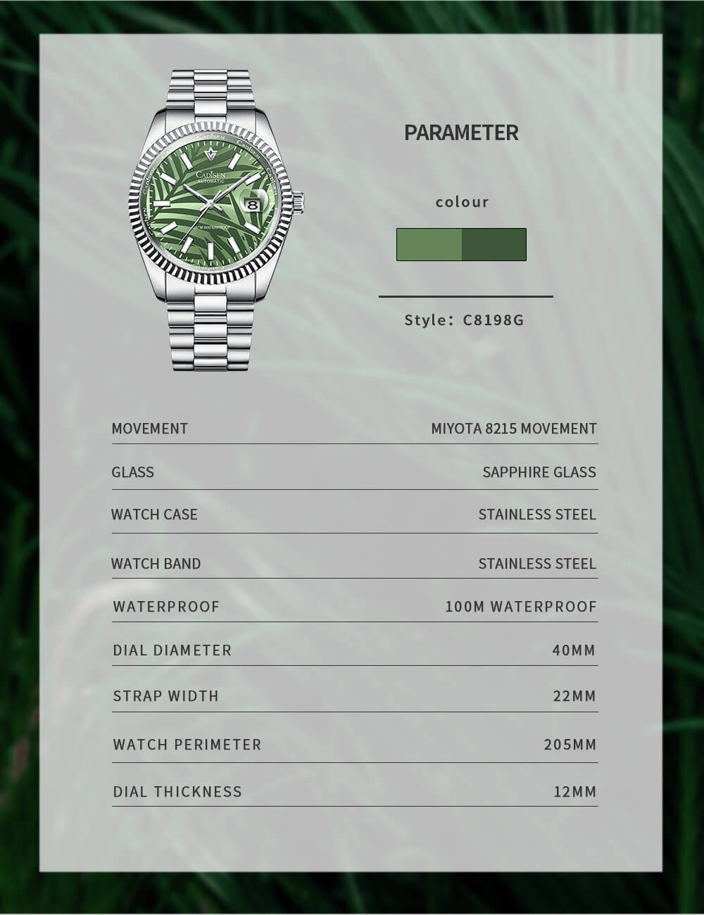 Thương Hiệu CADISEN Quốc gia đăng ký thương hiệu Nhật Bản Kiểu máy Nhật Bản (Japan Movt) Mã sản phẩm C8198M Giới tính Nam Loại sản phẩm Đồng hồ cơ (Automatic) Đường kính mặt 38