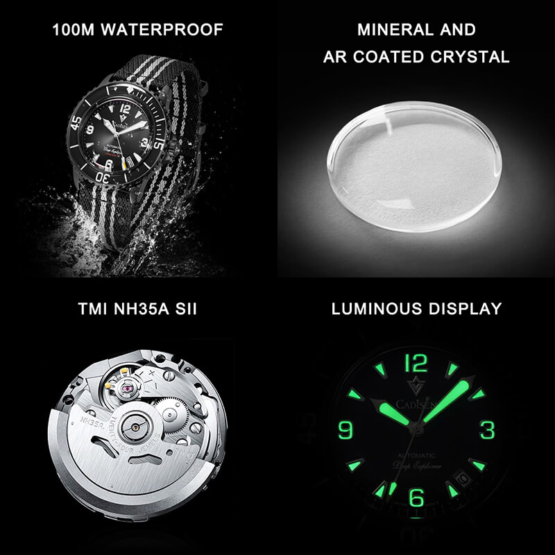 Mua tại TiktokThương Hiệu CADISEN Quốc gia đăng ký thương hiệu Nhật Bản Kiểu máy Nhật Bản (Japan Movt) Mã sản phẩm C8239M1 Giới tính Nam Loại sản phẩm Đồng hồ cơ (Automatic) Đường kính mặt 42 mm Chiều dày 12.5 mm Chất liệu vỏ Thép không gỉ 316L Chất liệu dây Dây dù cao cấp Chất liệu mặt kính Sapphire Độ chịu nước 10 ATM Bảo hành 24 tháng