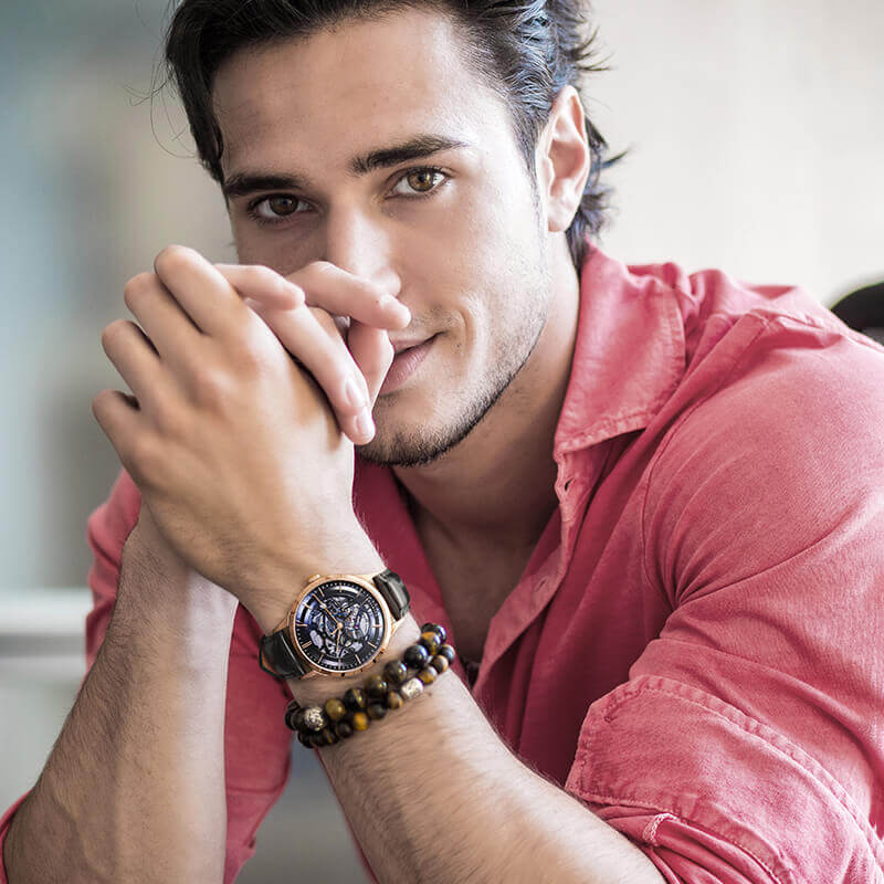 KHUNG XƯƠNG của bộ máy cơ khí được KHOE TRỌN toàn mặt số, những chi tiết màu vàng kim kết nối với nhau, tô điểm bằng những viên chân kính lấp lánh - Càng nhìn càng cuốn hút!