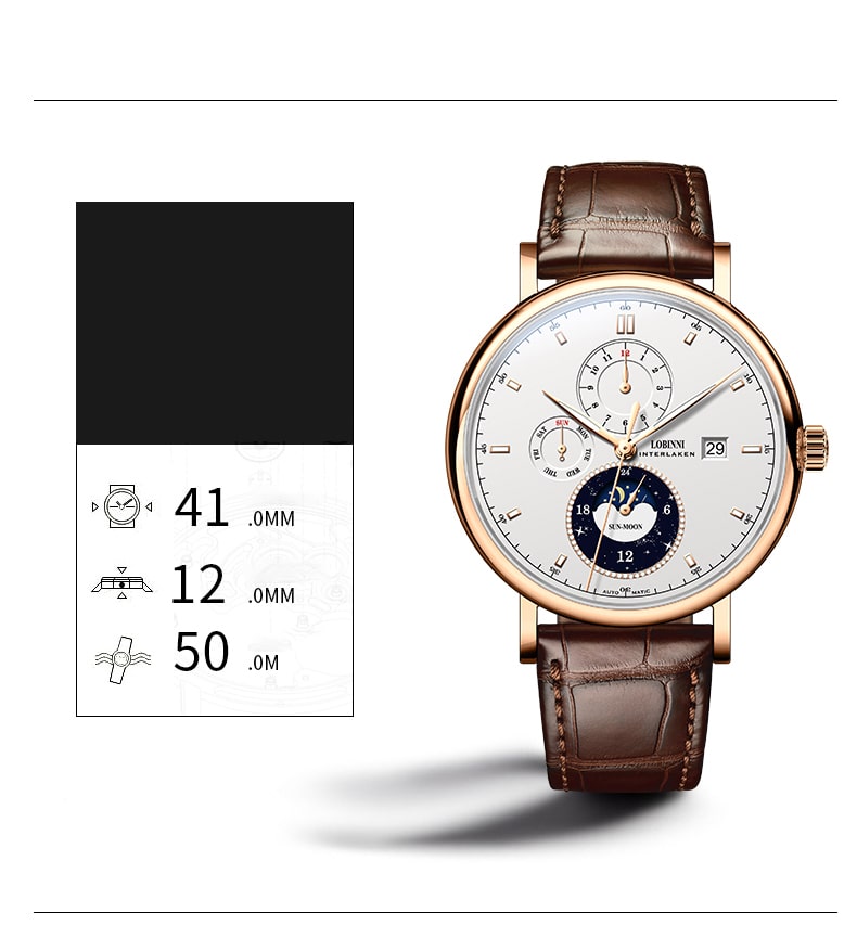 Nhãn hiệu LOBINNI Mã sản phẩm No.9010-1 Giới tính Nam Kiểu máy Automatic (Máy Cơ) Đường kính mặt 42 mm Độ dày 11 mm Chất liệu vỏ Thép không gỉ 316L Chất liệu dây Dây da cao cấp Chất liệu mặt kính Sapphire Khả