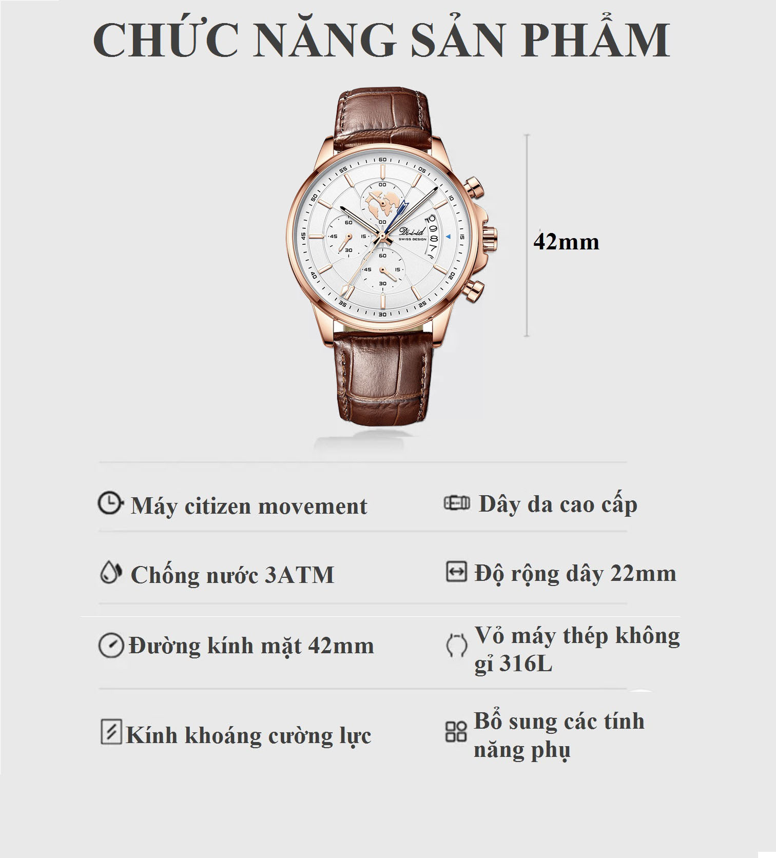 Nhãn hiệu LOBINNI Mã sản phẩm No.3604-4 Giới tính Nam Kiểu máy Quartz ( Chạy pin ) Đường kính mặt 40 mm Độ dày 9 mm Chất liệu vỏ Thép không gỉ 316L Chất liệu dây Dây da cao cấp Chất liệu mặt