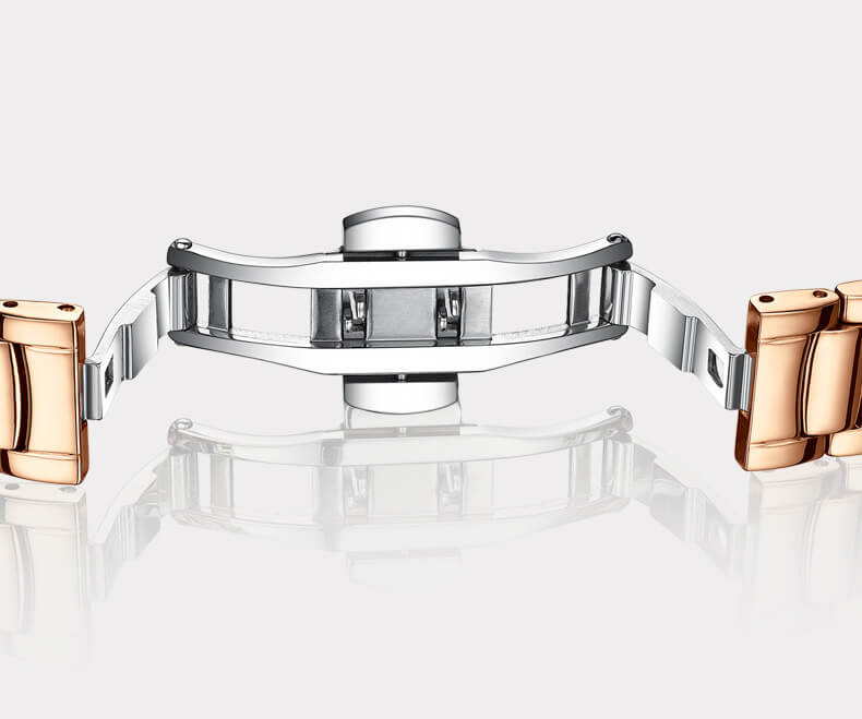 Đặc điểm kỹ thuật Chốt gập ba Dây đeo bằng thép không gỉ Mặt kính khoáng Chống nước Giờ hiện hành thông thường Đồng hồ kim: 3 kim (giờ, phút, giây), 3 mặt số (24