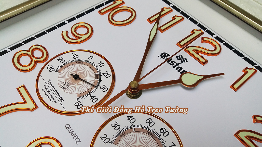 (*) Nhiệt ẩm kế tự động sử dụng nguyên lý co dãn của lò so kim loại dựa trên điều kiện thời tiết để hiển thị nhiệt độ và độ ẩm xung quanh nơi treo đồng hồ. Không nên sử dụng cho mục đích khác. Đây cũng không phải là dụng cụ nhiệt ẩm kế chuyên dụng. Mức sai số của Nhiệt kế là ± 2oC. Mức sai số của Ẩm kế là ± 10%.