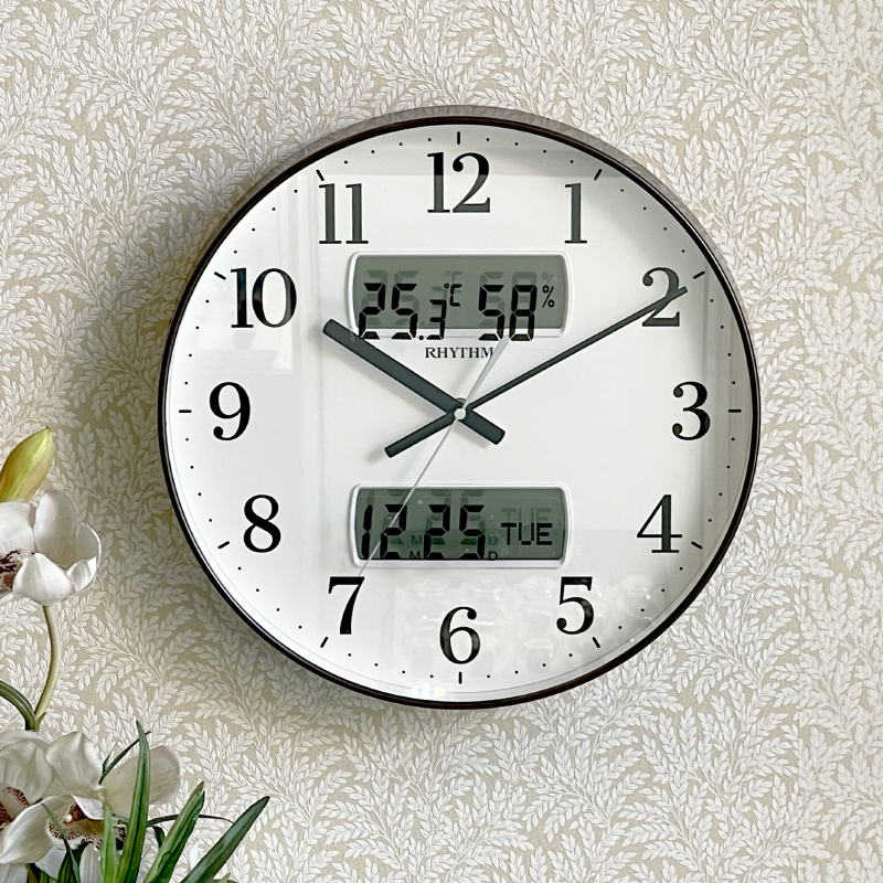 Đồng hồ treo tường Rhythm CFG724NR06, dùng pin (AAx2), vỏ nhựa màu nâu kim loại. Kích thước 36.0 x 4.5cm, trọng lượng 1,24Kg. 2 Màn hình hiện thị lịch ngày thứ tháng,nhiệt độ và độ