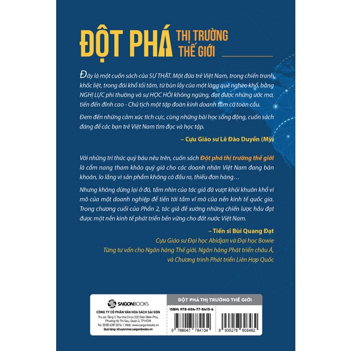 "Với những tri thức quý báu nêu trên, cuốn sách Đột phá thị trường thế giới là cẩm nang tham khảo quý giá cho các doanh nhân Việt Nam đang băn khoăn, lo lắng vì sản phẩm không có đầu ra, thiếu đơn hà Nhưng không dừng lại ở đó, tầm nhìn của tác giả đã vượt khỏi khuôn khổ vi mô của một doanh nghiệp để tiến tới tầm vĩ mô của nền kinh tế quốc gia. Trong chương cuối của Phần 2, tác giả đề xướng những chiến lược hầu đạt được một nền kinh tế phát triển bền vững cho đất nước Việt Nam." - Tiến sĩ Bùi Quang Đạt; Cựu Giáo sư Đại học Abidjan và Đại học Bowie; Từng tư vấn cho Ngân hàng Thế giới, Ngân hàng Phát triển châu Á và Chương trình Phát triển Liên Hợp Quốc