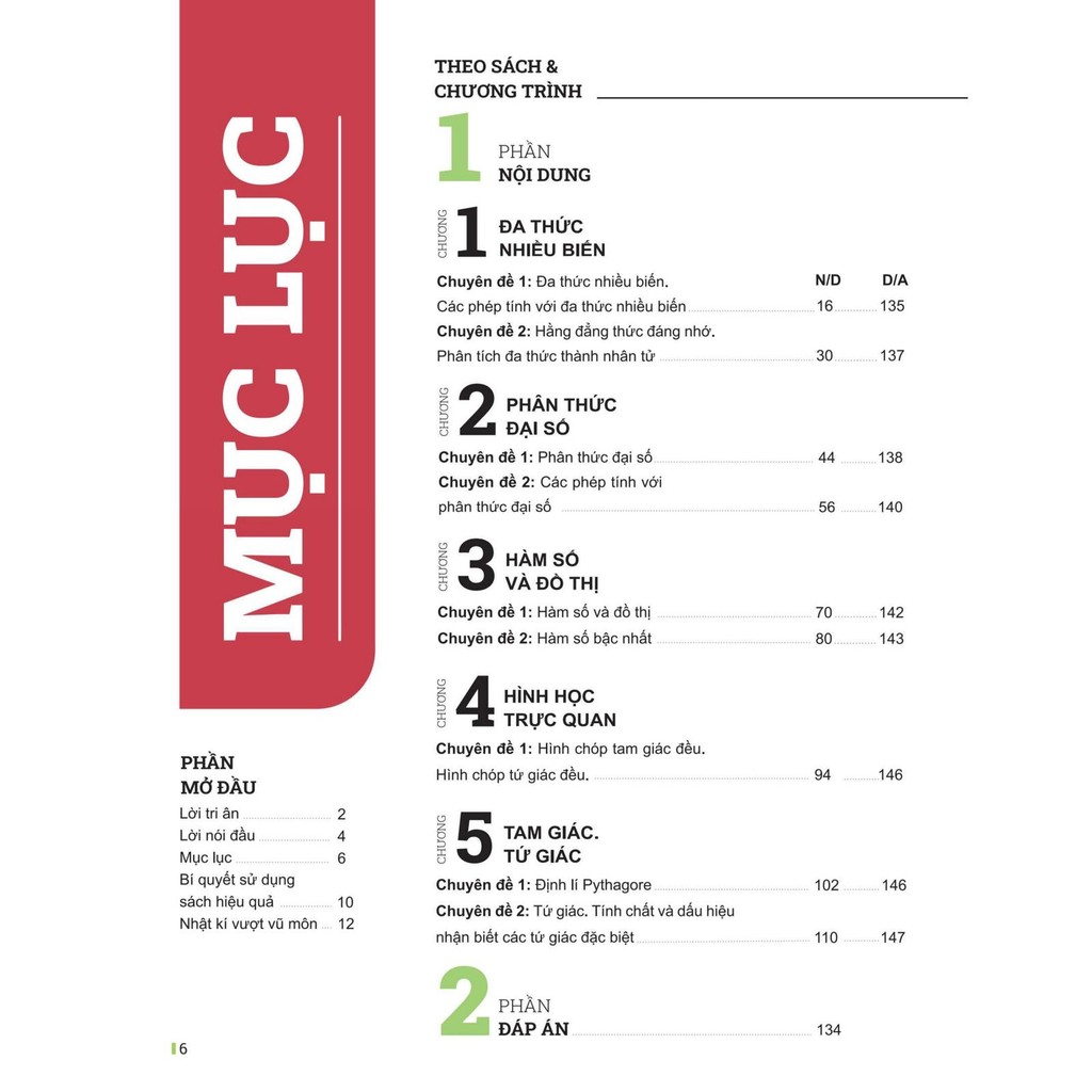 • Đề kiểm tra đánh giá nhanh (Trắc nghiệm + Tự luận) - Phần 2: Đáp án Cam kết: 100% đều có đáp án + lời giải chi tiết, cách trình bày hướng dẫn chi tiết dễ hiểu. Nếu con xuất phát điểm hơi yếu vẫn có thể hiểu được và dần dần từng bước tiến bộ khi học đúng theo lộ trình và phương pháp của sách. ƯU ĐIỂM NỔI BẬT CỦA BỘ SÁCH ĐỘT PHÁ TƯ DUY: Bám sát chương trình học: Giúp học sinh nắm vững kiến thức cốt lõi, tự tin trong mọi kỳ thi với lộ trình học rõ ràng, hiệu quả. Infographic trực quan: Lý thuyết được minh họa sinh động, dễ hiểu, giúp học sinh tiếp thu nhanh chóng. Phân dạng bài tập chi tiết: Bài tập được phân loại với hướng dẫn cụ thể, phát triển tư duy giải quyết vấn đề. Sơ đồ tư duy: Hệ thống hóa kiến thức rõ ràng, khơi gợi tư duy logic và sáng tạo. Đề tự đánh giá: Giúp học sinh tự ôn luyện, phát hiện và cải thiện lỗ hổng kiến thức. Học liệu tặng kèm: Cung cấp tài liệu phong phú, luôn cập nhật, hỗ trợ học tập toàn diện. ... và rất nhiều điều tuyệt vời khác nữa. KHÁM PHÁ 10 LỢI ÍCH TỪ BỘ SÁCH ĐỘT PHÁ TƯ DUY: Nắm vững kiến thức cốt lõi: Giúp học sinh hiểu sâu và chắc chắn kiến thức nền tảng trong chương trình Toán lớp 8. Tự tin trong các kỳ thi: Với phương pháp học hiệu quả, học sinh có thể đạt điểm cao mà không cần học thêm quá nhiều. Phát triển tư duy logic: Hệ thống bài tập và sơ đồ tư duy giúp rèn luyện tư duy phân tích và giải quyết vấn đề. Tiếp cận kiến thức dễ dàng hơn: Infographic sinh động giúp học sinh dễ dàng hiểu và ghi nhớ kiến thức một cách trực quan. Tự học hiệu quả: Học sinh có thể tự lập kế hoạch học tập và tiến bộ mà không cần quá nhiều sự hỗ trợ từ người khác. Phát hiện và cải thiện lỗ hổng kiến thức: Hệ thống đề tự đánh giá giúp học sinh nhận ra điểm yếu và cải thiện kịp thời. Tăng cường khả năng sáng tạo: Sơ đồ tư duy không chỉ giúp hệ thống hóa kiến thức mà còn kích thích tư duy sáng tạo. Tiết kiệm thời gian học thêm: Bộ sách cung cấp lộ trình rõ ràng, giúp học sinh tự học tại nhà mà vẫn đạt hiệu quả cao. Tăng động lực học tập: Phương pháp học mới lạ, hấp dẫn giúp học sinh hứng thú và yêu thích việc học hơn. Truy cập học liệu phong phú: Học sinh được hỗ trợ bởi hệ thống học liệu đa dạng và luôn cập nhật, giúp quá trình học trở nên dễ dàng hơn. Bộ sách Đột Phá Tư Duy Toán Lớp 8 chính là minh chứng cho một chân lý đơn giản: “Chỉ cần học đúng cách, mọi học sinh đều có thể tự học và đạt điểm cao dễ dàng.” Với bộ sách này, các em học sinh sẽ được trang bị những công cụ cần thiết để tự tin đạt điểm 8 trở lên mà không cần phải học thêm. Hãy để bộ sách trở thành người bạn đồng hành đáng tin cậy, giúp các em vững bước trên con đường học tập và chinh phục mọi kỳ thi! Gooda tin rằng cuốn sách này sẽ không chỉ cung cấp cho bạn những kiến thức quý giá mà còn mang đến những trải nghiệm đọc sách tuyệt vời. Chúng tôi hy vọng rằng đây sẽ là một viên ngọc quý trên giá sách của bạn!   QUYỀN LỢI KHÁCH HÀNG KHI MUA SÁCH TẠI SHOP NHÀ SÁCH GOODA: