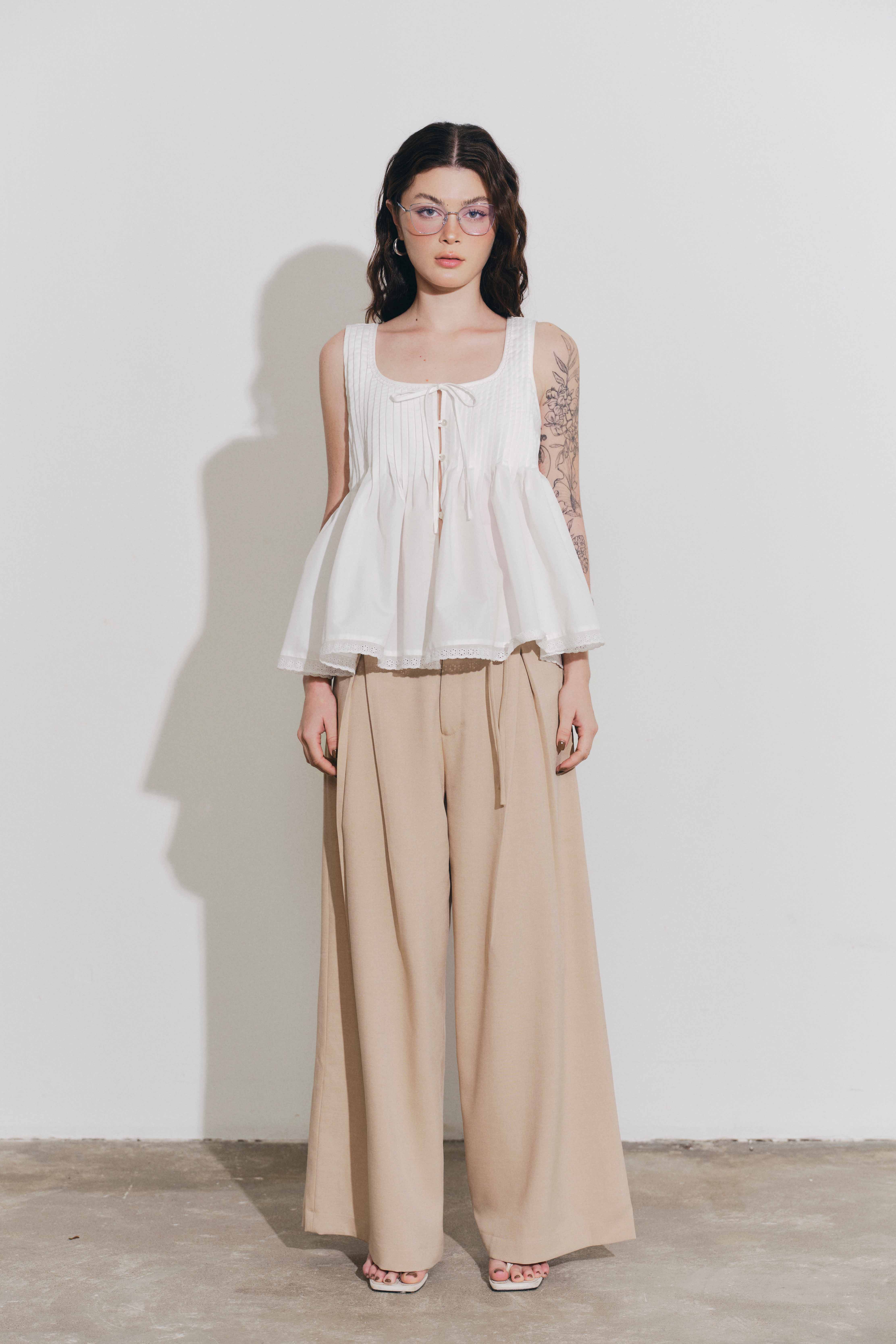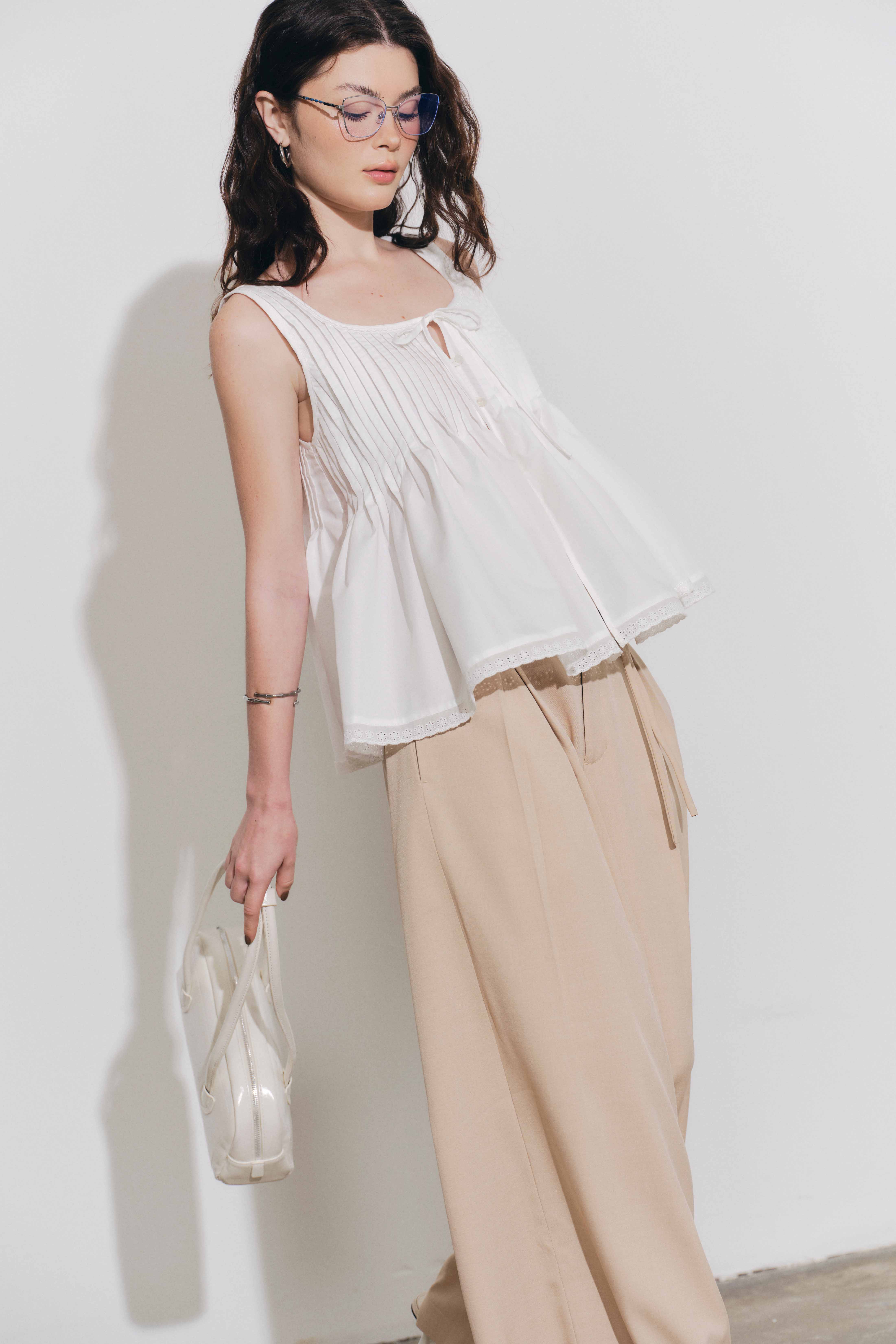 Áo kiểu dáng suông Không tay Cổ cao viền bèo, ruy băng gân viền thắt nơ cổ Cài bằng nút phía sau Chất liệu chính: Polyester Ruy băng gân Polyester Cắt may thủ công tinh