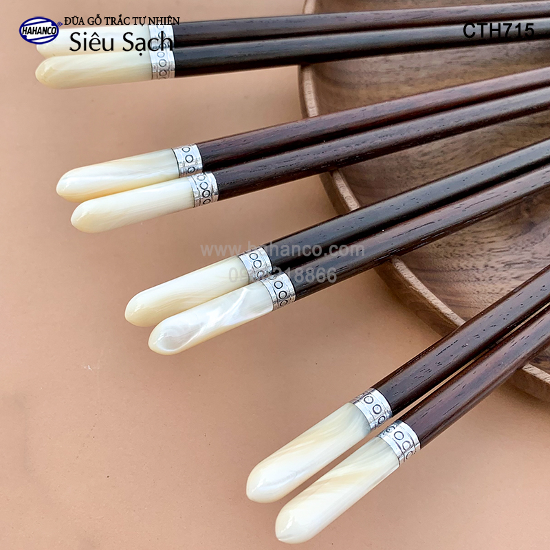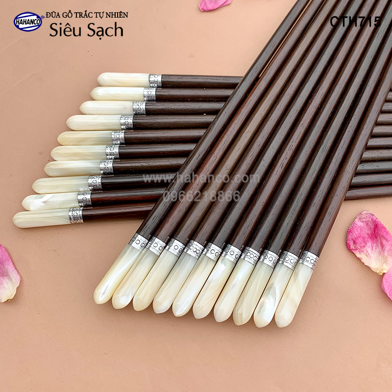 Đũa gỗ Trắc để mộc được gắn đầu ốc biển nhập khẩu từ New Zealand và Úc, vùng biển sạch nhất thế giới, những loại ốc quý hiếm và bào ngư mới sống được, ánh xà cừ rất đẹp, nhìn sang trọng và khác biệt trên bàn ăn gia đình bạn.