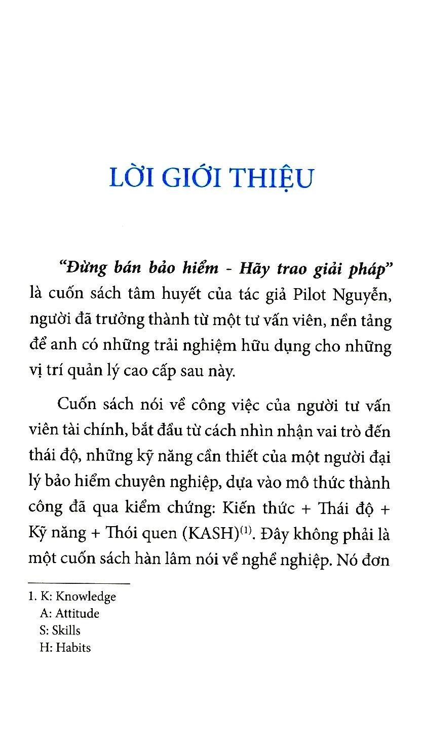 Đừng bán bảo hiểm Hãy trao giải pháp là cuốn sách tâm huyết của tác giả Pilot Nguyễn, người đã trưởng thành từ một tư vấn viên, nền tảng để anh có những trải nghiệm