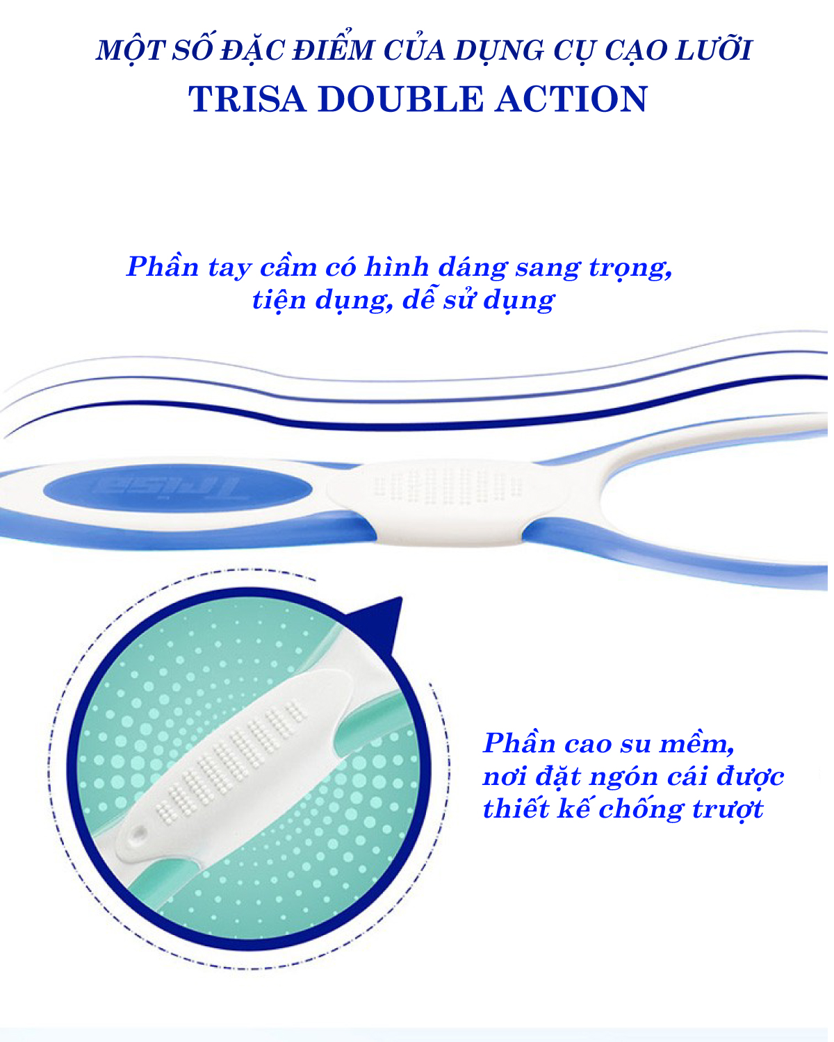 LÀM SẠCH LƯỠI CÙNG TRISA DOUBLE ACTION Cạo Lưỡi Trisa Double Action được thiết kế theo hình dạng tự nhiên của lưỡi Phần cạo lưỡi có 2 dạng: Active Clean dùng để loại bỏ những mảng bám cứng đầu, Sensitive Clean làm sạch nhẹ nhàng kể cả những nơi nhạy cảm. Phần cao su mềm, nơi đặt ngón cái được thiết kế chống trượt Phần tay cầm có hình dáng sang trọng, tiện dụng. dễ sử dụng Chất lượng sản phẩm đã được kiểm nghiệm và được các nha sĩ khuyên dùng Hãy dùng kèm cạo lưỡi vào mỗi lần đánh răng để có được một hàm răng chắc khỏe, trắng sáng và hơi thở luôn thơm mát cả ngày nhé!