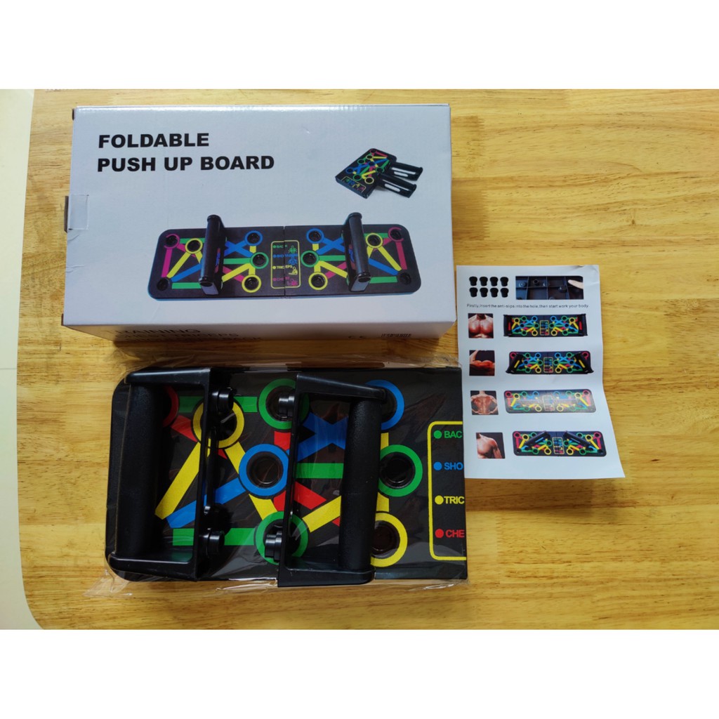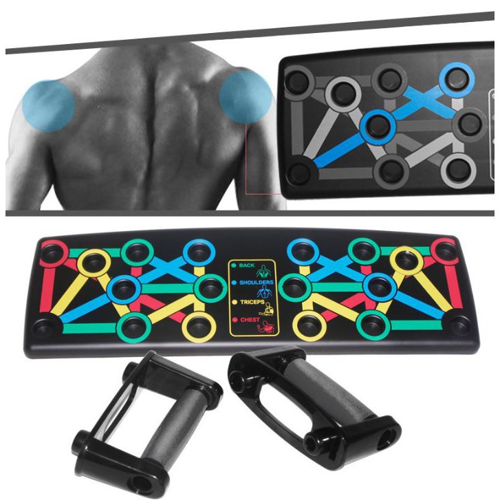 - Dụng cụ tập thể hình, hỗ trợ chống đẩy , hít đất có các khấc luyện tập tương ứng với các mô cơ trên cơ thể, như cơ bắp tay, cơ Bộ dụng cụ đầy đủ gồm: 1 bảng đế hướng dẫn + 2 tay nắm + đế cao su Thiết kế với 4 màu tương ứng với 4 khu vực các tay cầm bỏ vào vị trí muốn tập tương ứng