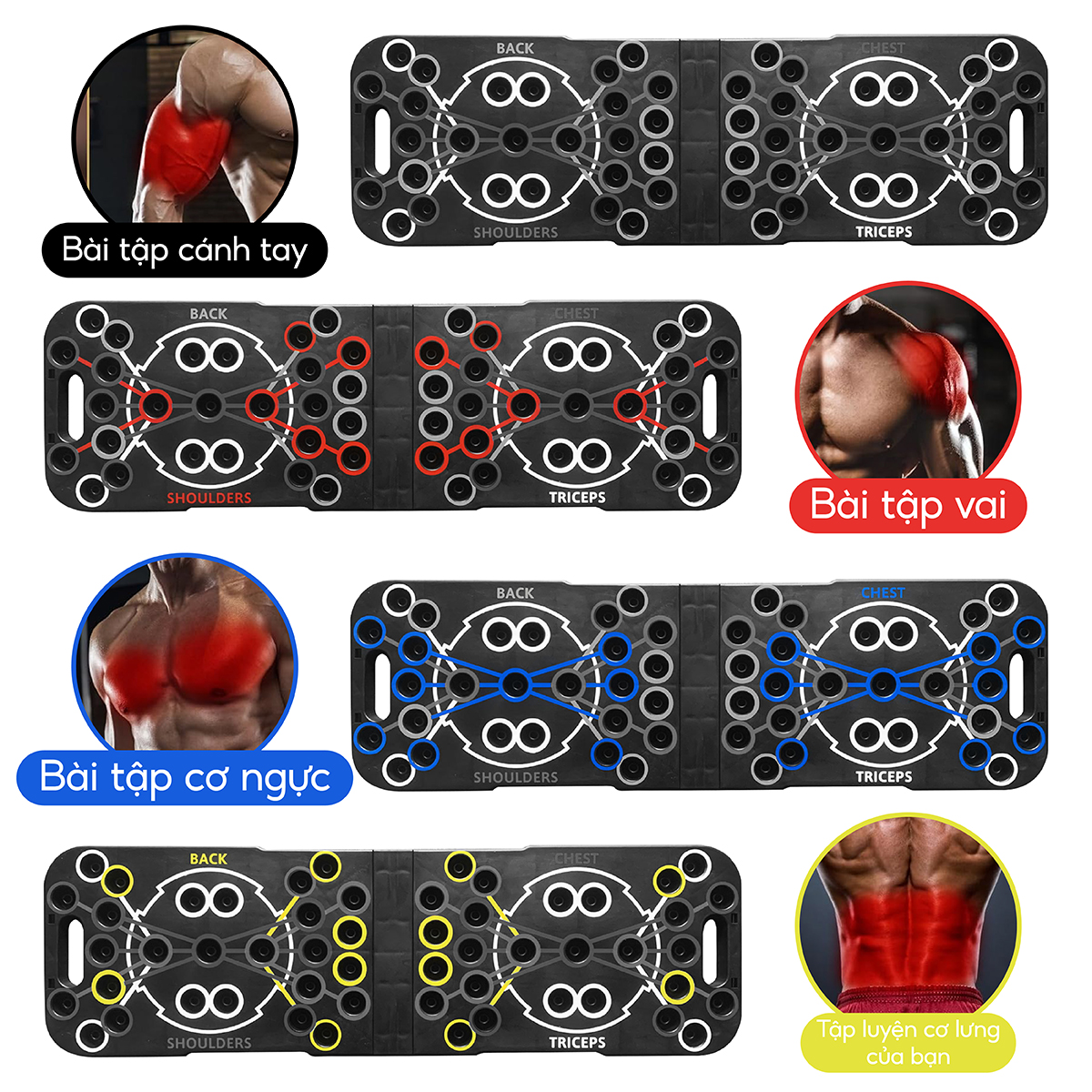 ️- Luyện tập các cơ: Cơ ngực, cơ vai, cơ lưng, cơ bắp tay với các vị trí được thể hiện trên bảng tập.