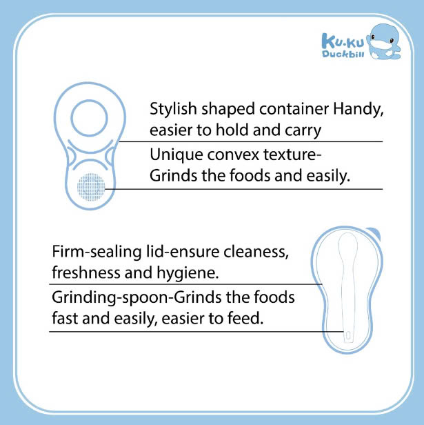 Dụng Cụ Nghiền Thức Ăn Cho Bé KuKu KU3009 gồm 1 chén nghiền thức ăn, 1 nắp đậy và 1 muỗng. Chén được chia thành 2 phần, giúp mẹ vừa nghiền vừa đựng thức ăn cho bé rất tiện lợi. Lòng muỗng nhỏ giúp mẹ có thể cho bé ăn dễ dàng hơn. Thêm vào đó, nắp đậy đảm bảo vệ sinh thực phẩm sau khi chế biến.