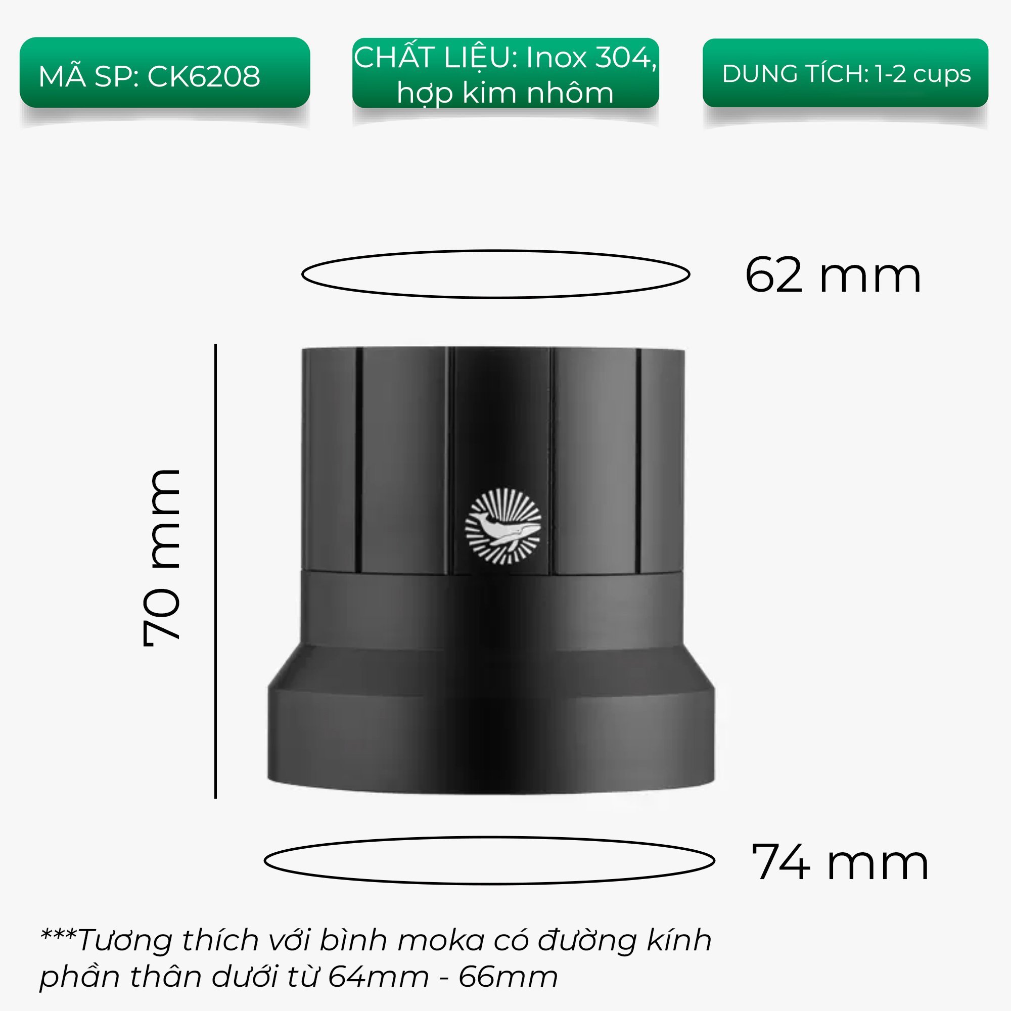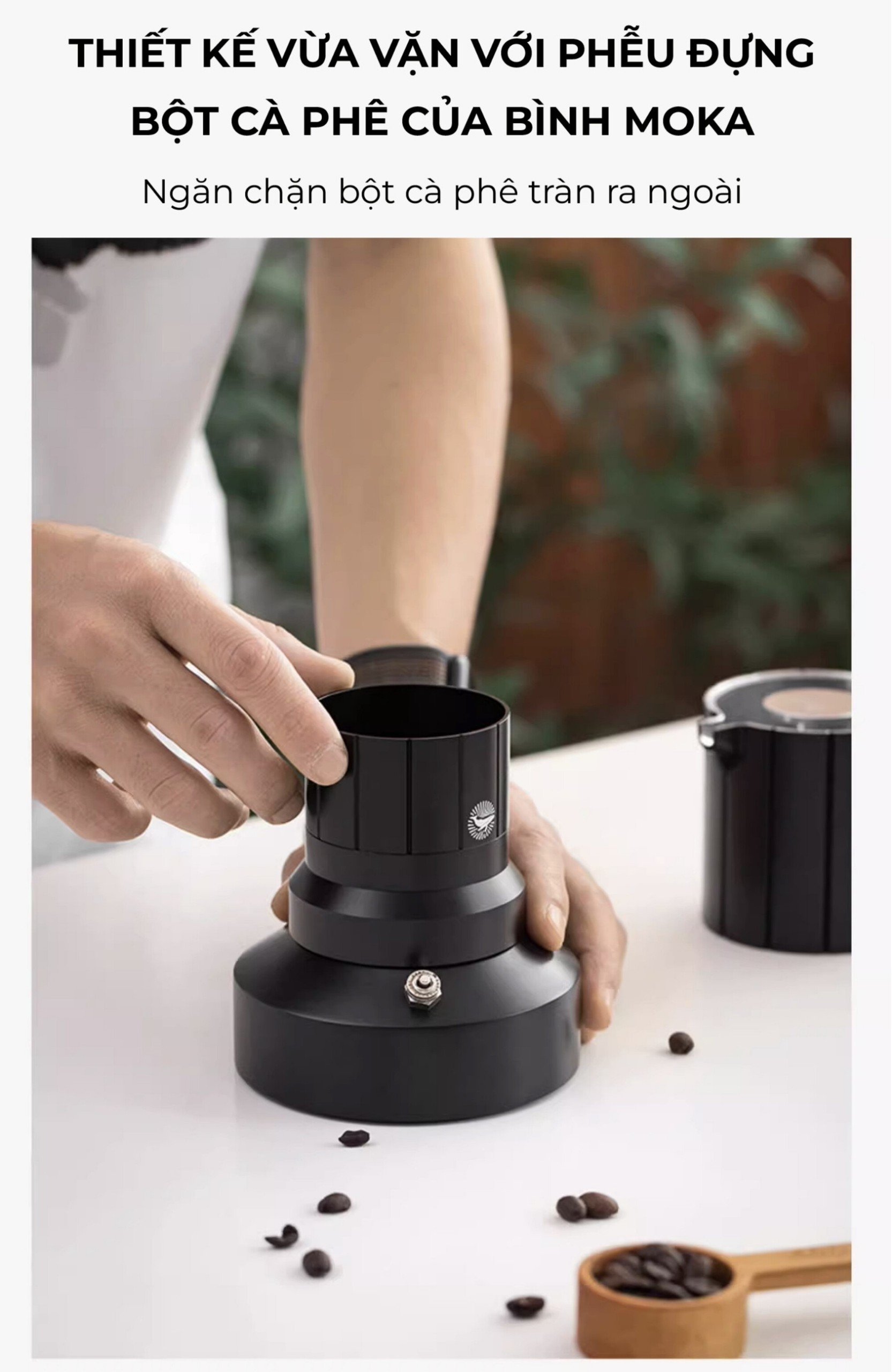 OCD SAN PHẲNG CÀ PHÊ CHO BÌNH MOKA 2 CUP CAFEDE KONA Vòng đong cà phê pha Moka được thiết kế với hai chức năng chính: Ngăn bột cà phê không bị đổ ra ngoài trong quá trình đong cà phê vào phễu đựng Moka. Phân bố bột cà phê đều khắp giỏ lọc. Sản phẩm được làm từ inox 304/hợp kim nhôm . Bạn có thể vệ sinh dễ dàng bằng nước hoặc chổi vệ sinh. Lưu ý: Sản phẩm chỉ tương thích với bình moka có đường kính phần thân dưới từ 64mm-66mm