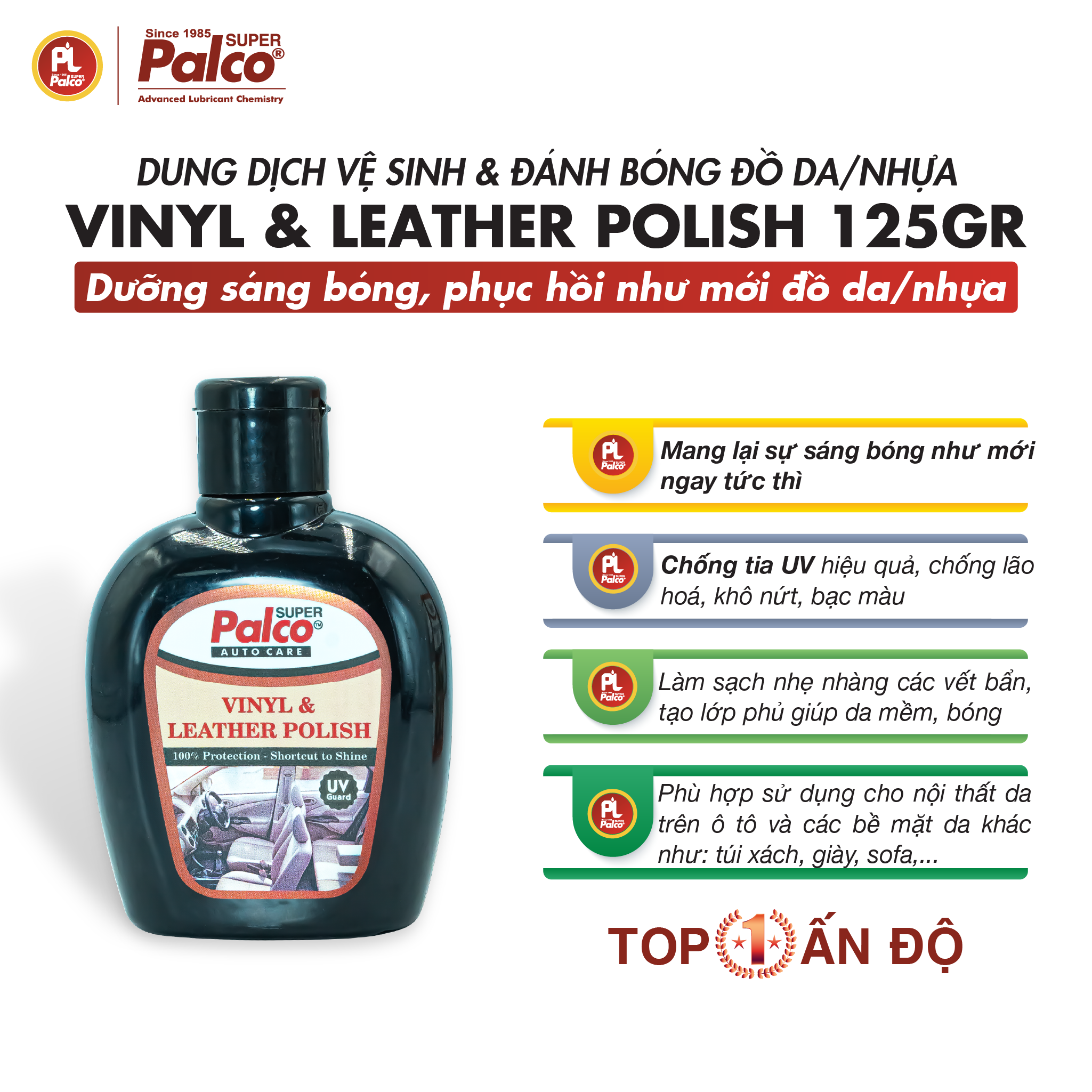 GIỚI THIỆU VỀ SẢN PHẨM DUNG DỊCH ĐÁNH BÓNG ĐỒ DA PALCO VINYL & LEATHER POLISH: Palco Vinyl & Leather Polish là dung dịch dạng kem lỏng chuyên dụng để đánh bóng bảo dưỡng đồ da và giả da. Sản phẩm có công thức thiết kế để duy trì tính chất tự nhiên mềm bóng của đồ da, chống khô nứt, bạc màu, chống tia UV làm lão hóa bề mặt da, mang lại sự bóng mượt như mới cho các bề mặt da và giả da. Sản phẩm dễ sử dụng và tiện lợi, có tính ứng dụng cao trong đời sống hàng ngày. TÍNH NĂNG NỔI BẬT CỦA DUNG DỊCH ĐÁNH BÓNG ĐỒ DA PALCO VINYL & LEATHER POLISH: