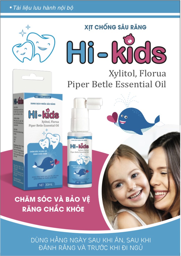 Thông tin chung (gốc) Xịt chống sâu răng Hi- Kids với công thức tối ưu mang lại hiệu quả cao. Thành phần : Xylitol, Flos Chrysanthe-mi Flower Extract ( Chiết xuất hoa cúc ) ; Cinnamomum Camphora; Essential Oil ( Tinh dầu Long não ) Ocimum Gratissimum Essential Oil ( Tinh dầu hương nhu); Piper bettle Essential Oil ( tinh dầu lá trầu không ) ; Thymus vulgaris Essential oil ( tinh dầu xạ hương ) ; PEG 40 hydrogenated castor oil; Natri florua ; Sodium chlorid; acid citric monohydrate; Glycerin; Propylene Sản phẩm được nghiên cứu chuyên sâu , có tác dụng hữu dụng, rất dể sử dụng cho trẻ nhỏ . Đặc biệt với sự kết hợp của Xylitol, Florua và chiết xuất từ lá trầu không , giúp sát khuẩn , ức chế virus gây hại cho răng miệng . Chỉ định