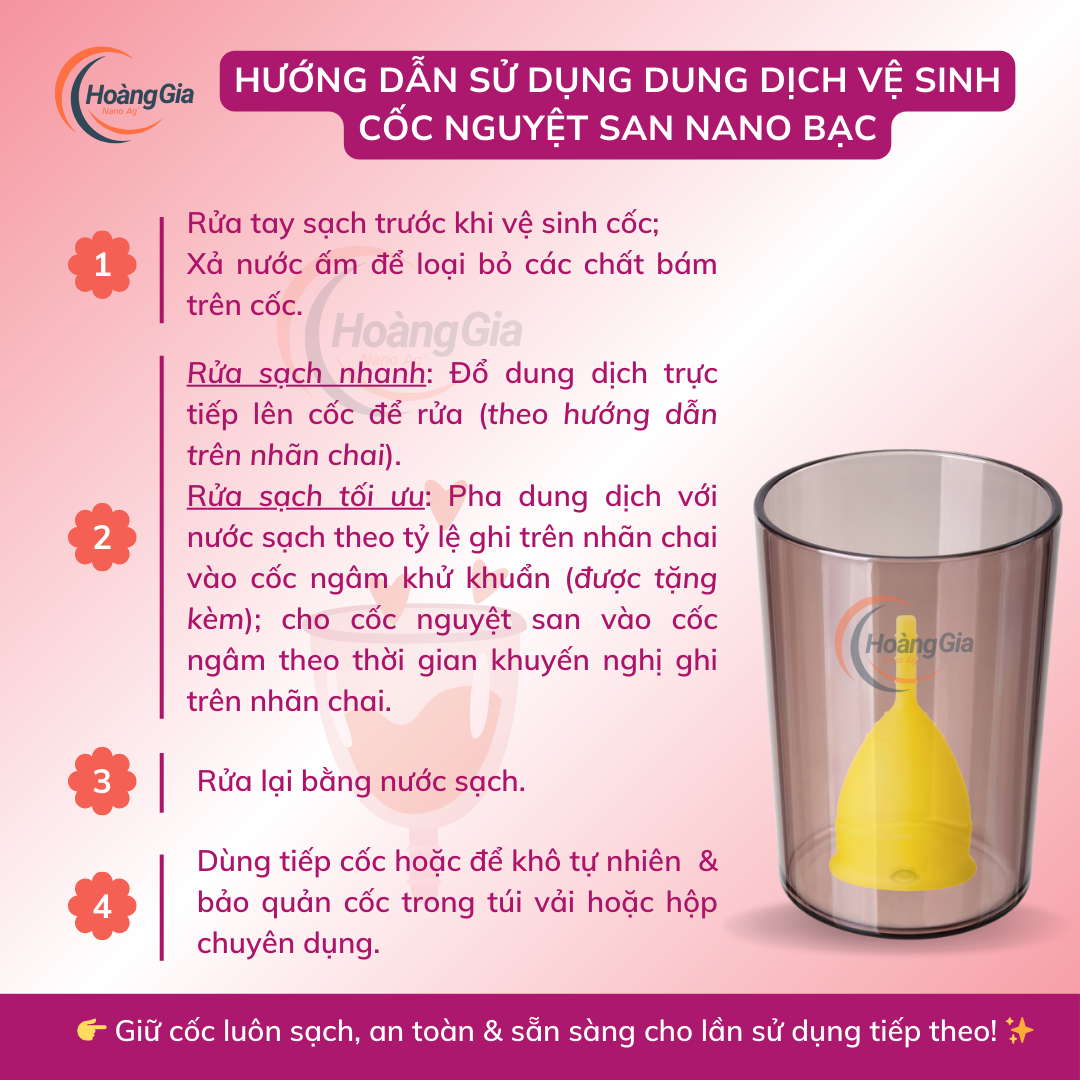 Chỉ sử dụng nước vệ sinh nano bạc để làm sạch cốc nguyệt san, không dùng để vệ sinh trực tiếp vùng nhạy cảm.