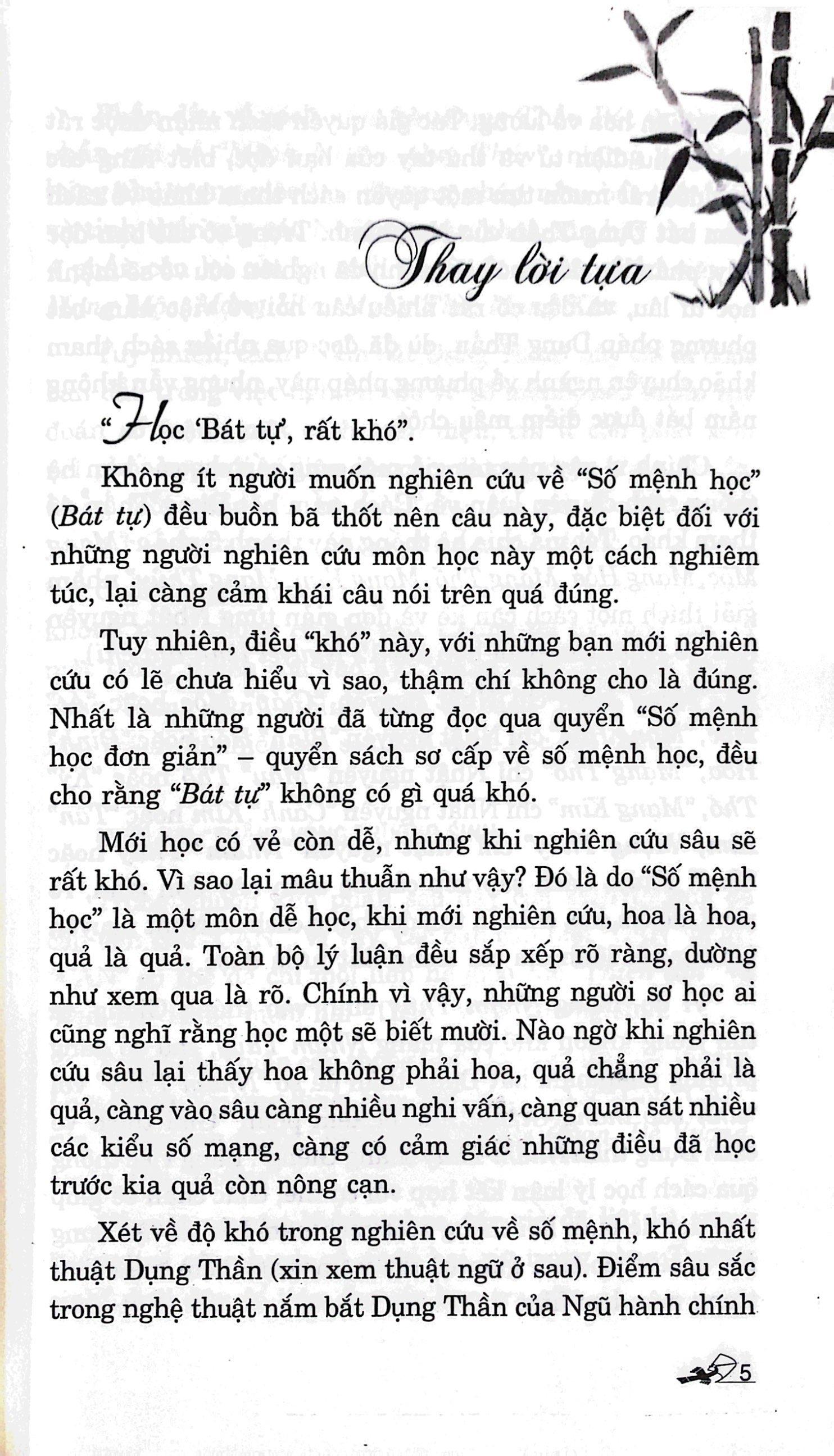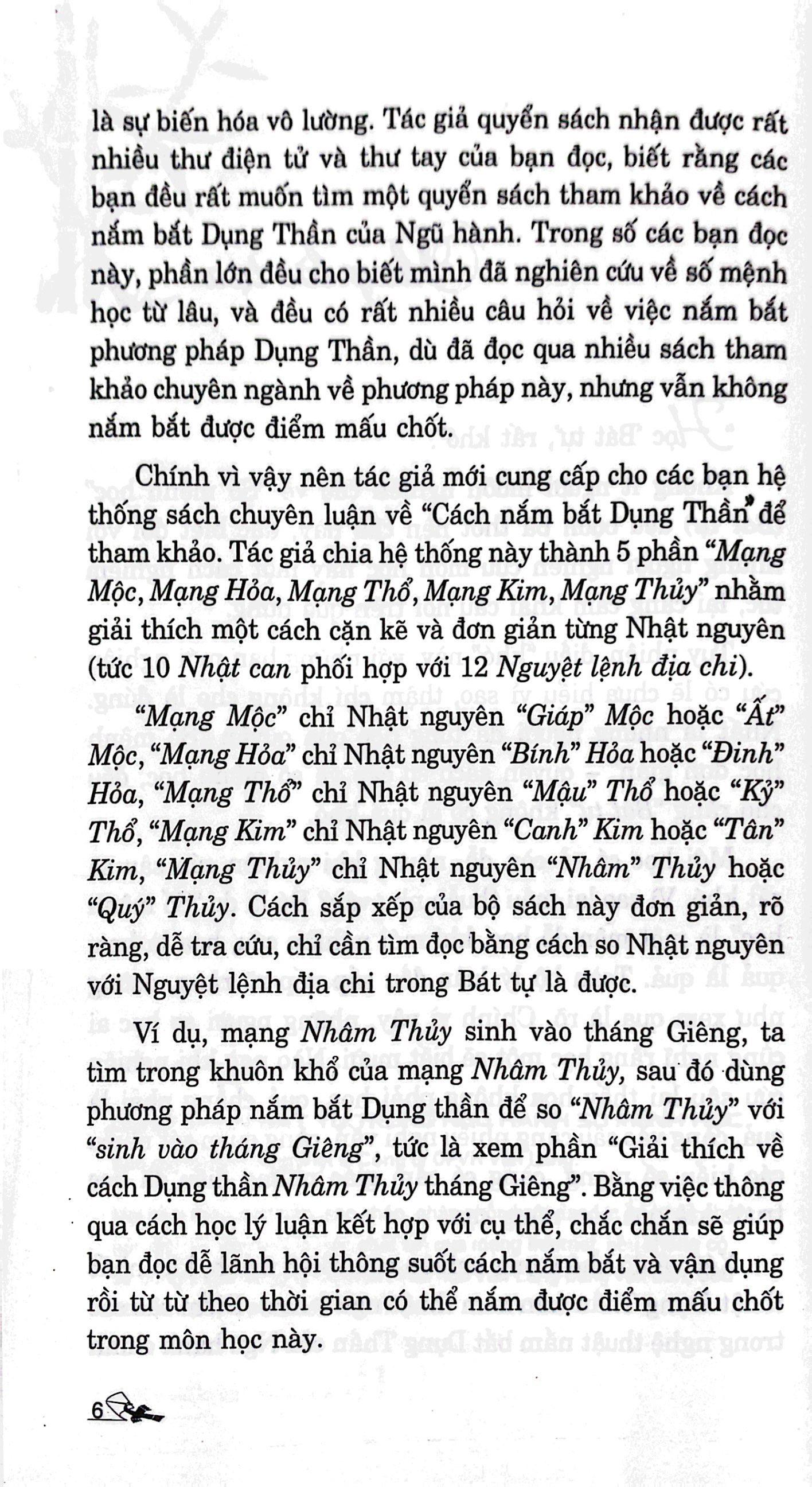 Nghiên cứu về số mệnh học, khó nhất là thuật Dụng Thần. Điểm sâu sắc trong nghệ thuật nắm bắt Dụng Thần của Ngũ hành chính là sự biến hóa vô lường, cho nên dù có đọc qua một số tài liệu tham khảo chuyên ngành về phương pháp này nhưng nhiều người vẫn chưa nắm bắt được điểm mấu chốt vì không dựa theo hệ thống chuyên luận mà tác giả sẽ trình bày đầy đủ bằng cách chia hệ thống này thành 5 thành phần “Mạng Mộc, Mạng Hỏa, Mạng Thổ, Mạng Kim, Mạng Thủy” nhằm giải thích một cách cặn kẽ và đơn giản từng Nhật Nguyên (tức 10 Nhật can phối hợp với 12 Nguyệt Lệnh địa chi).
