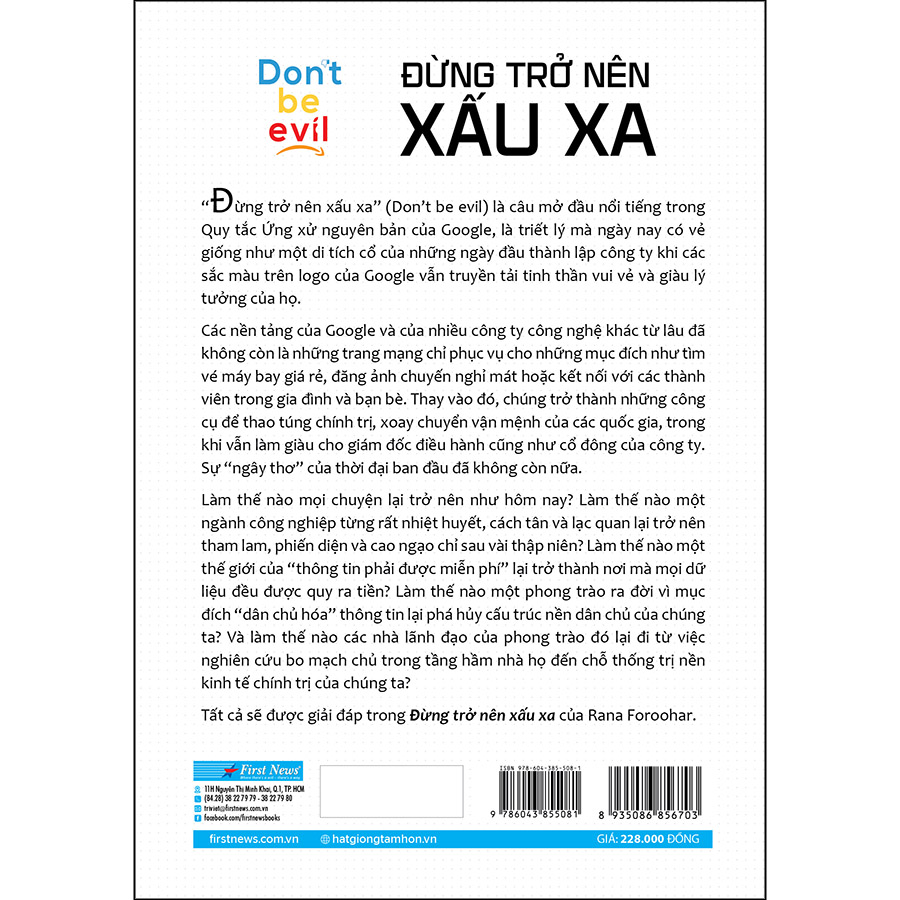 Là biên tập viên kinh tế của Financial Times và nhà phân tích kinh tế toàn cầu cho CNN, Rana Foroohar đã dành nhiều năm quan sát và phân tích các tập đoàn công nghệ lớn (Big Tech), đặc biệt là 5 công ty lớn thuộc nhóm FAANG – Facebook, Apple, Amazon, Netflix và Google – từ đó đưa ra nhiều phát hiện “gây sốc” trong cuốn sách “Đừng trở nên xấu xa” (tựa gốc: “Don’t Be Evil”).
