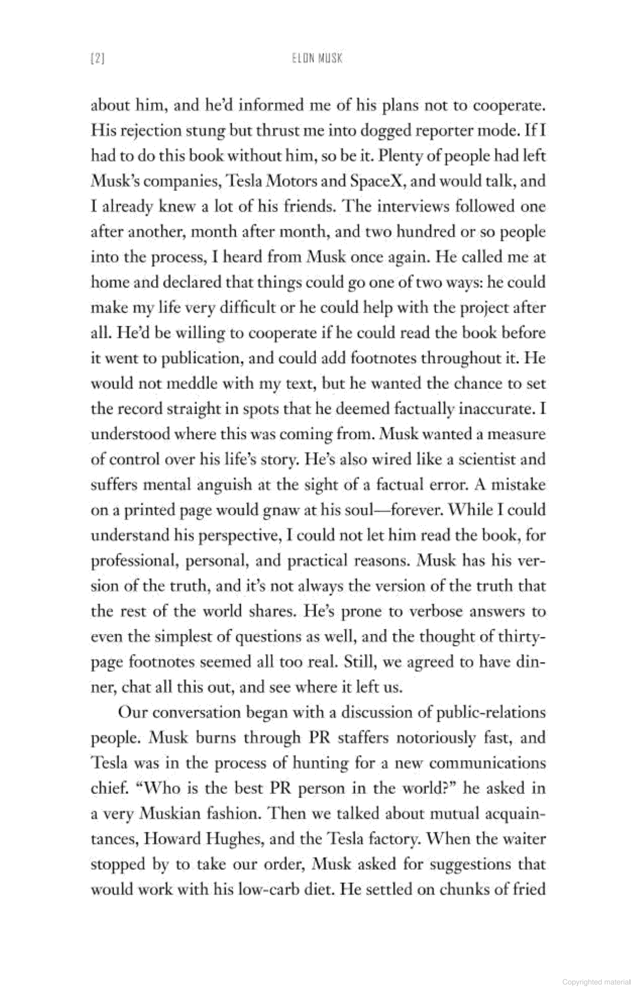 In Elon Musk: Tesla, SpaceX, and the Quest for a Fantastic Future, veteran technology journalist Ashlee Vance provides the first inside look into the extraordinary life and times of Silicon Valley's most audacious entrepreneur. Written with exclusive access to Musk, his family and friends, the book traces the entrepreneur's journey from a rough upbringing in South Africa to the pinnacle of the global business world. Vance spent more than 30 hours in conversation with Musk and interviewed close to 300 people to tell the tumultuous stories of Musk's world-changing companies: PayPal, Tesla Motors, SpaceX and SolarCity, and to characterize a man who has renewed American industry and sparked new levels of innovation while making plenty of enemies along the way.