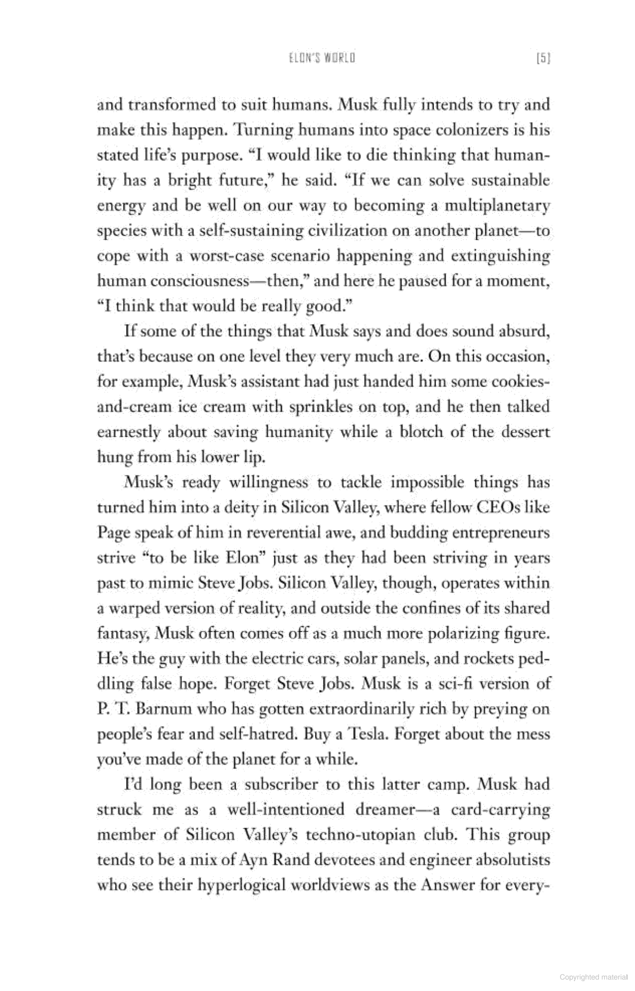 Vance uses Musk's story to explore one of the pressing questions of our time: can the nation of inventors and creators which led the modern world for a century still compete in an age of fierce global competition? He argues that Musk--one of the most unusual and striking figures in American business history--is a contemporary of legendary inventors and industrialists like Thomas Edison, Henry Ford, Howard Hughes, and Steve Jobs. More than any other entrepreneur today, Musk has dedicated his energies and his own vast fortune to inventing a future that is as rich and far-reaching as the visionaries of the golden age of science-fiction fantasy.