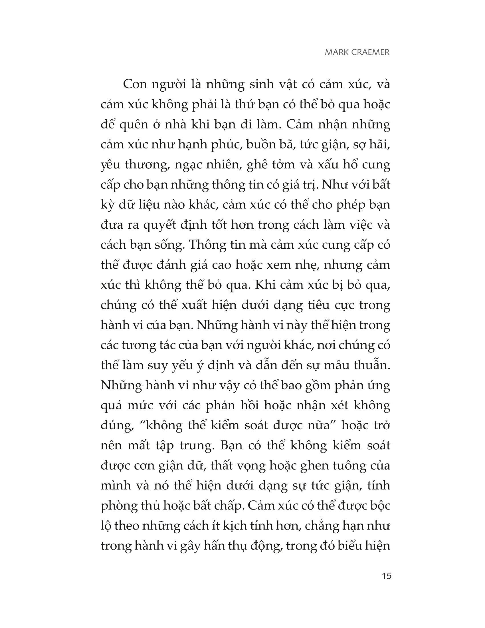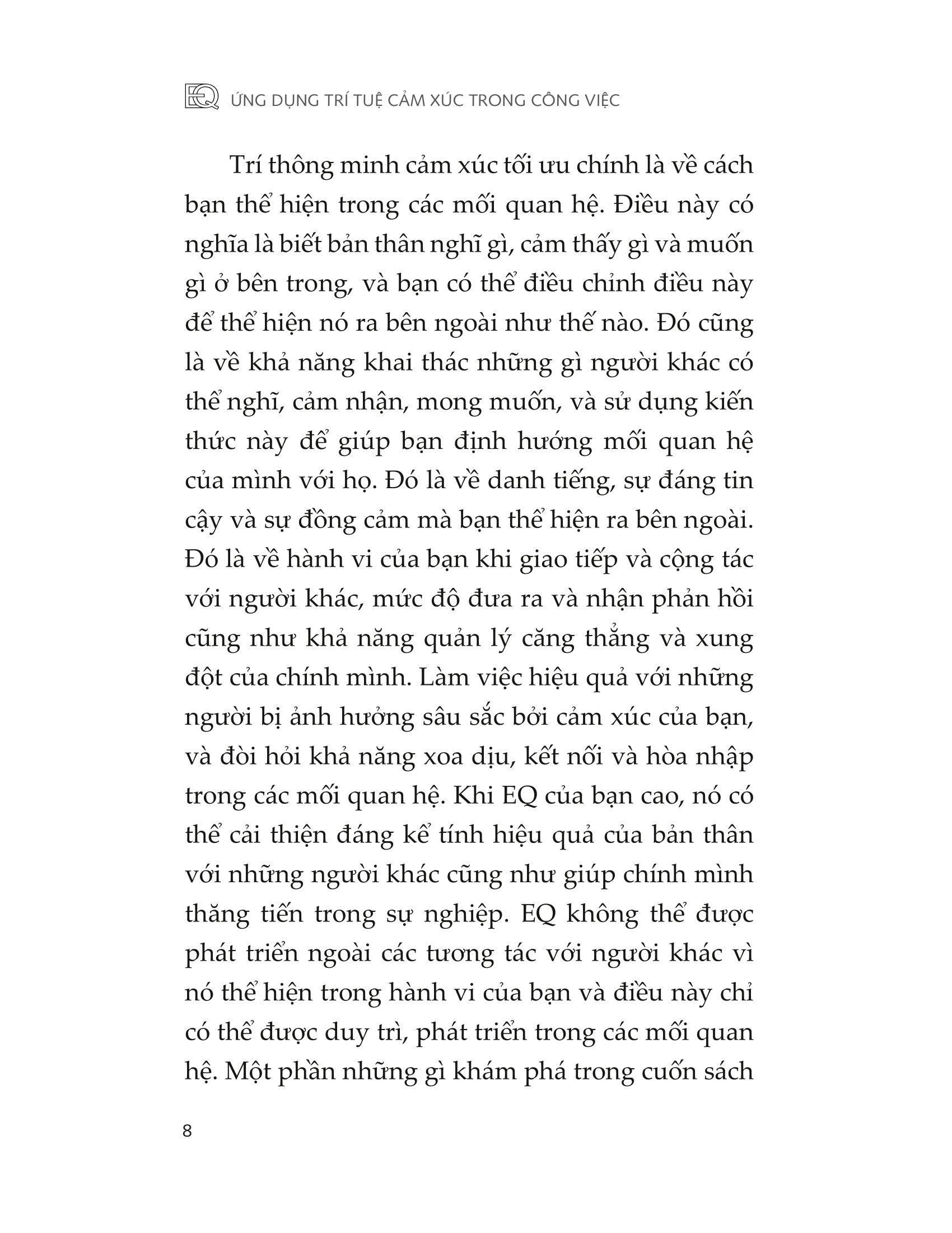 Trí thông minh cảm xúc tối ưu chính là về cách bạn thể hiện trong các mối quan hệ. Điều này có nghĩa là biết bản thân nghĩ gì, cảm thấy gì và muốn gì ở bên trong, và bạn có thể điều chỉnh điều này để thể hiện nó ra bên ngoài như thế nào. Đó cũng là về khả năng khai thác những gì người khác có thể nghĩ, cảm nhận, mong muốn, và sử dụng kiến thức này để giúp bạn định hướng mối quan hệ của mình với họ. Đó là về danh tiếng, sự đáng tin cậy và sự đồng cảm mà bạn thể hiện ra bên ngoài. Đó là về hành vi của bạn khi giao tiếp và cộng tác với người khác, mức độ đưa ra và nhận phản hồi cũng như khả năng quản lý căng thẳng và xung đột của chính mình. Làm việc hiệu quả với những người bị ảnh hưởng sâu sắc bởi cảm xúc của bạn, và đòi hỏi khả năng xoa dịu, kết nối và hòa nhập trong các mối quan hệ. Khi EQ của bạn cao, nó có thể cải thiện đáng kể tính hiệu quả của bản thân với những người khác cũng như giúp chính mình thăng tiến trong sự nghiệp. EQ không thể được phát triển ngoài các tương tác với người khác vì nó thể hiện trong hành vi của bạn và điều này chỉ có thể được phát triển duy trì trong các mối quan hệ. Một phần những gì khám phá trong cuốn sách này sẽ có ích nếu bạn không chọn thực hành các yếu tố EQ lên các mối quan hệ của mình. Điều này có thể yêu cầu bạn phải vượt ra ngoài vùng thoải mái để thay đổi hành vi của mình. Nó sẽ cần sự can đảm và, giống như bất cứ điều gì đáng làm, nó có thể đem lại lợi ích khổng lồ.