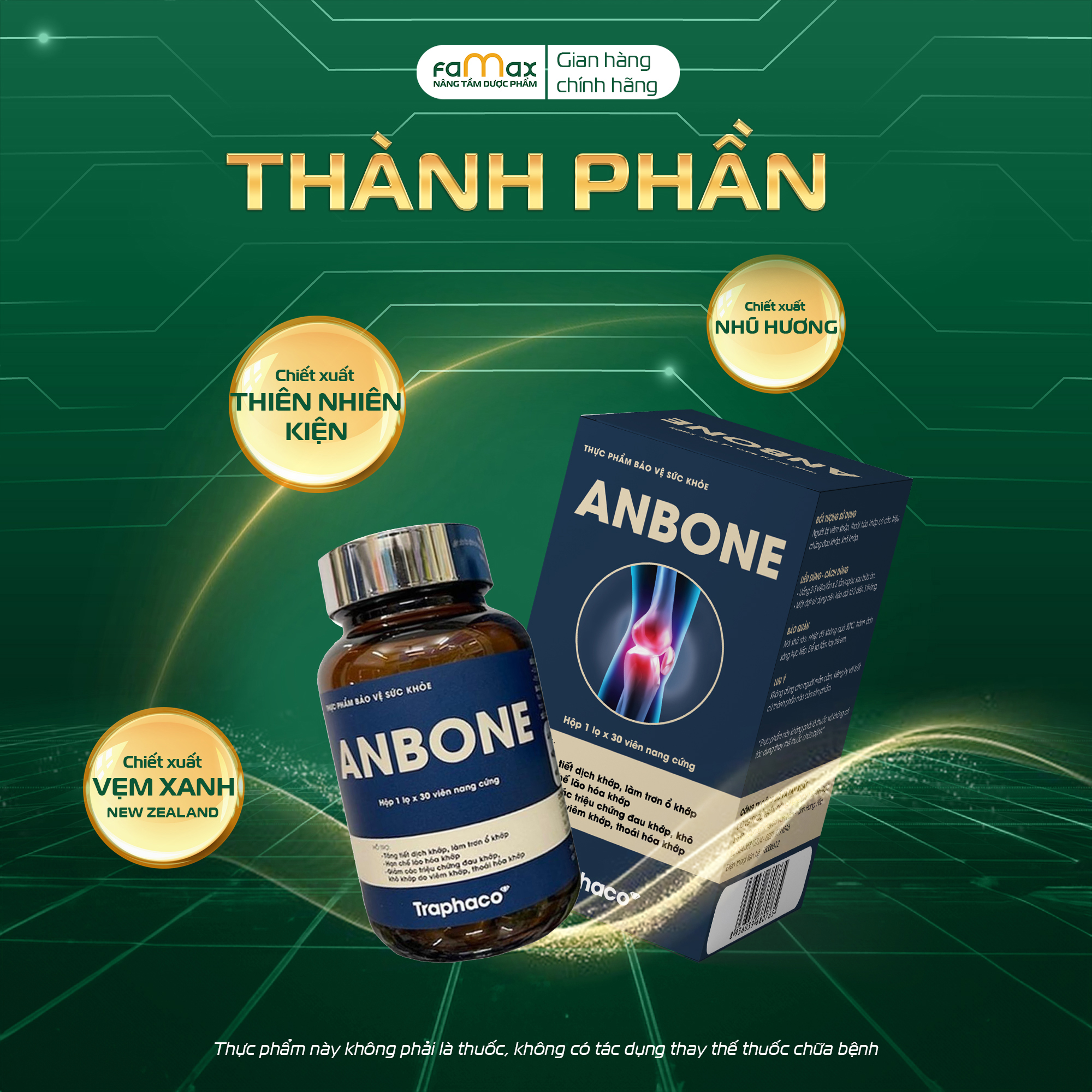 THỰC PHẨM BẢO VỆ SỨC KHỎE ANBONEThành phầnTrong mỗi viên nang cứng có chứa:– New Zealand Greenshell Mussel Extract…100 mg (Chiết xuất Vẹm xanh New Zealand)– Homalomena occulta Extract (Chiết xuất T...