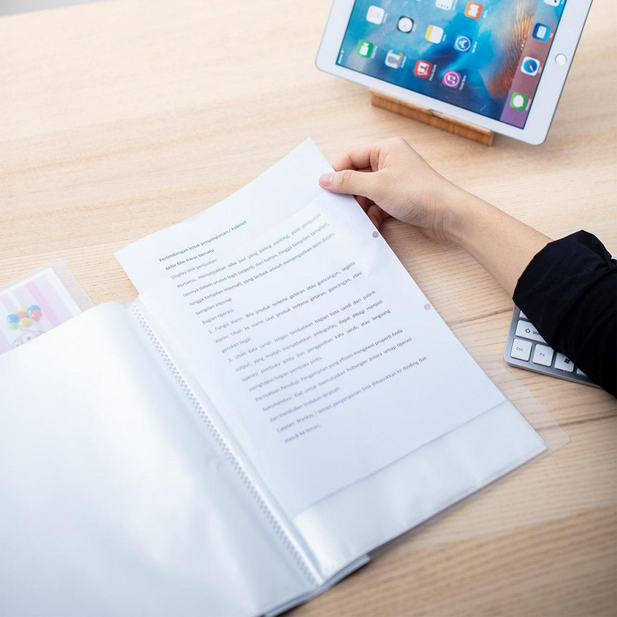 Các trang (lá) chứa hồ sơ làm bằng nhựa trong suốt có độ dẻo cao dễ dàng tách miệng kết hợp với công nghệ ép ly siêu âm của Nhật Bản tạo nên sự sắc nét cho những đường ly viền xung quanh nhưng vẫn đảm bảo độ bền khi sử dụng.