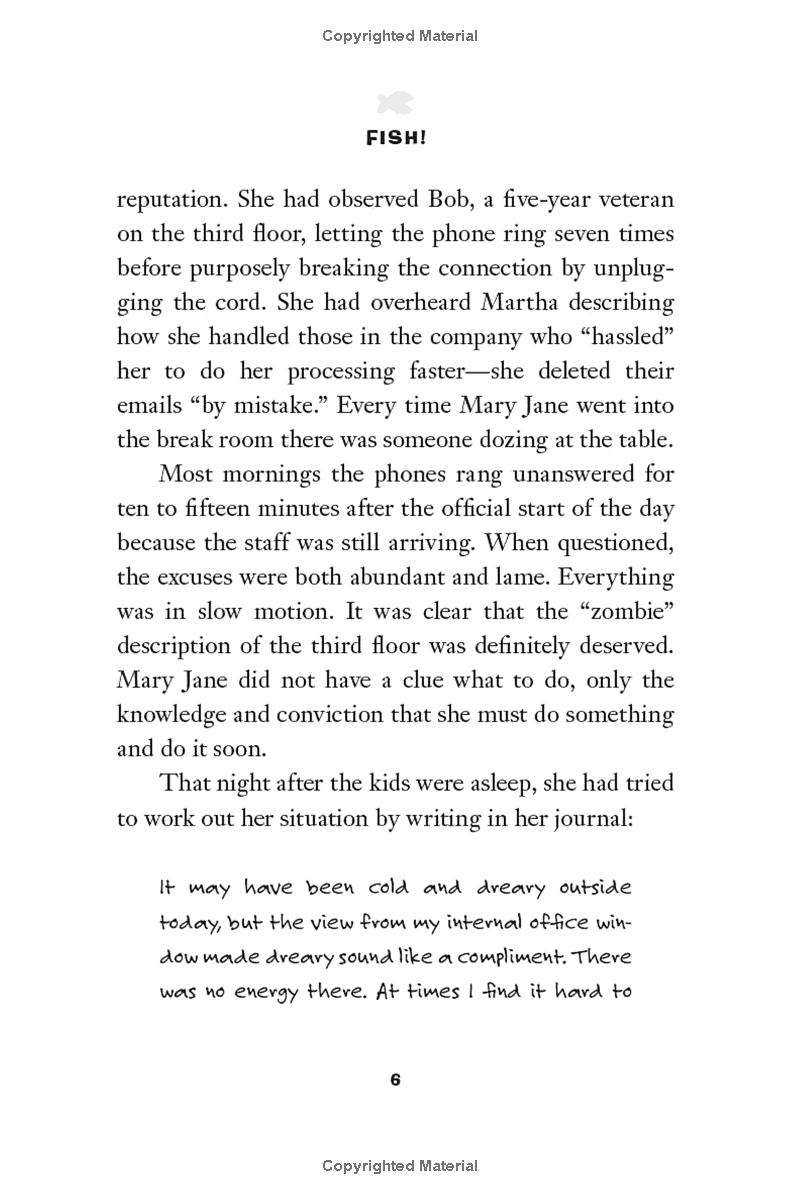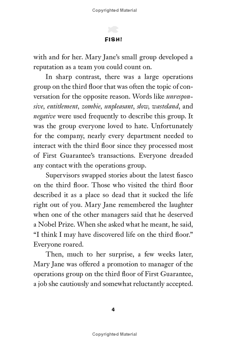 FISH! is the remarkable story of what happens when Mary Jane seeks the help of these unlikely business "experts" and learns their secret: four simple practices that, when applied daily, help anyone to be more energized, effective, and fulfilled.