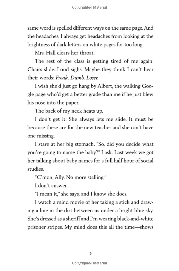 Ally has been smart enough to fool a lot of smart people. Every time she lands in a new school, she is able to hide her inability to read by creating clever yet disruptive distractions. She is afraid to ask for help; after all, how can you cure dumb? However, her newest teacher Mr. Daniels sees the bright, creative kid underneath the trouble maker. With his help, Ally learns not to be so hard on herself and that dyslexia is nothing to be ashamed of. As her confidence grows, Ally feels free to be herself and the world starts opening up with possibilities. She discovers that there’s a lot more to her and to everyone than a label, and that great minds don’t always think alike.