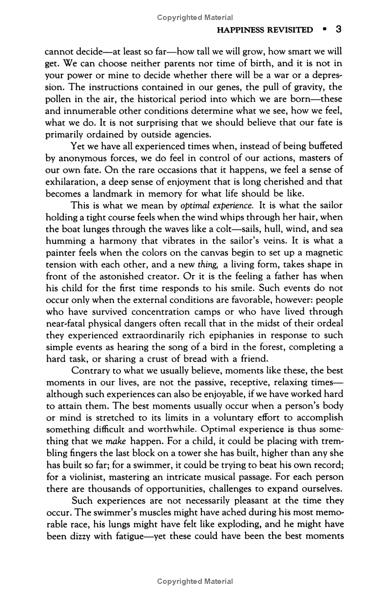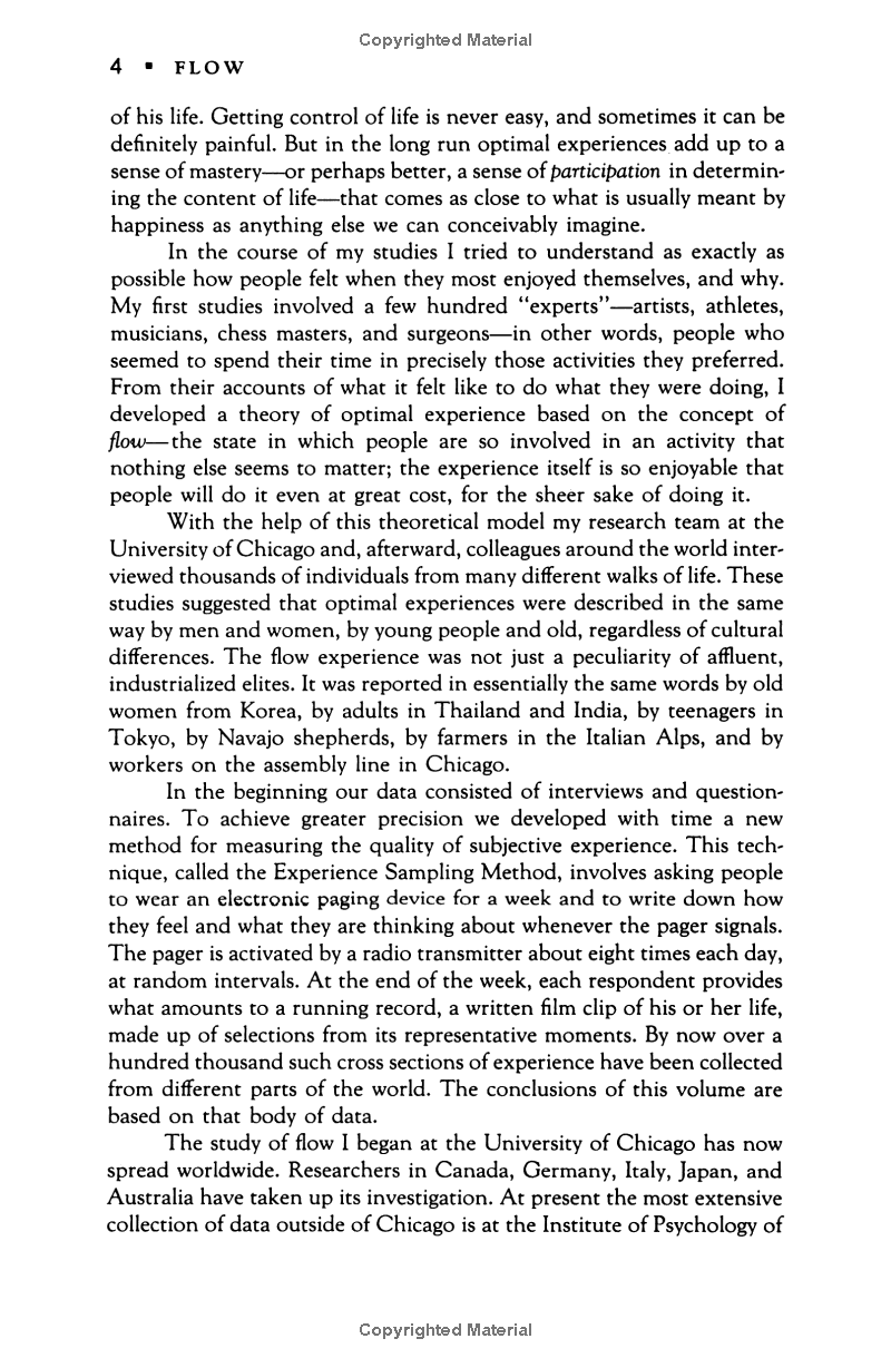 Flow: The Psychology of Optimal Experience Psychologist Mihaly Csikszentmihalyi's famous investigations of "optimal experience" have revealed that what makes an experience genuinely satisfying is a state of consciousness called flow. During flow, people typically experience