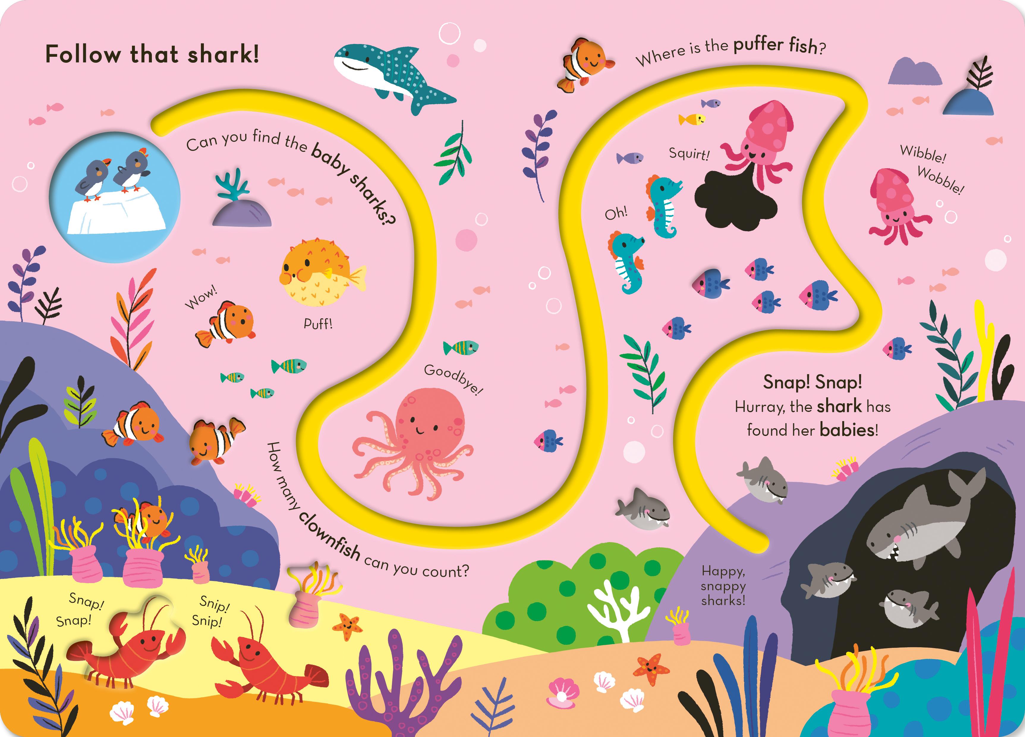 Explore the vibrant illustrations as you trace the grooved trails on each page with your fingers and follow the shark through the five different ocean scenes. Each scene is full of lots of splashing, snapping, and swimming sea creatures to spot too! There are die-cuts to find and feel, plus holes lead you through the pages as you follow that shark and find out where it is going!