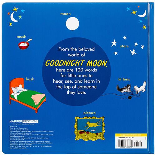 From The World of Goodnight Moon: 100 First Words A delightful word book illustrated with familiar and comforting art from the world of Goodnight Moon. Sturdy board pages with 100 words organized into categories