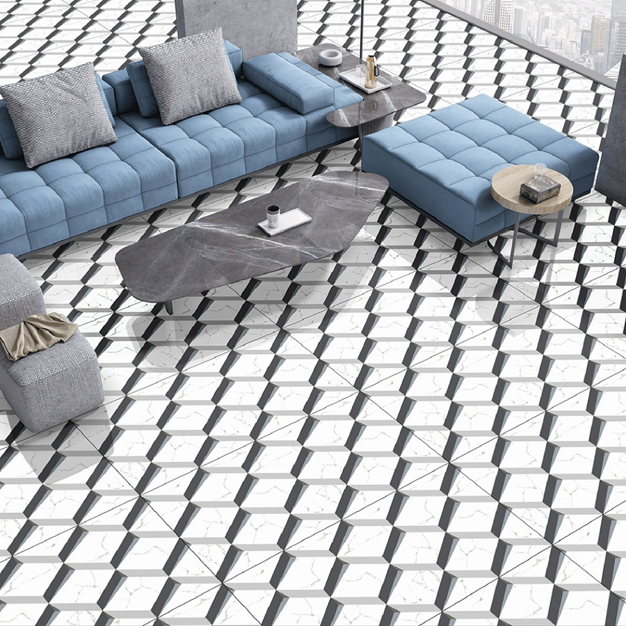 - Mẫu gạch kết hợp các tông màu chính tông màu trắng, xám và đen. Sự phối hợp giữa các màu này tạo ra hiệu ứng thị giác mạnh mẽ và hiện đại. Nền gạch có màu trắng với các đường vân giống như vân đá cẩm thạch, tạo nên sự thanh lịch và sang trọng.