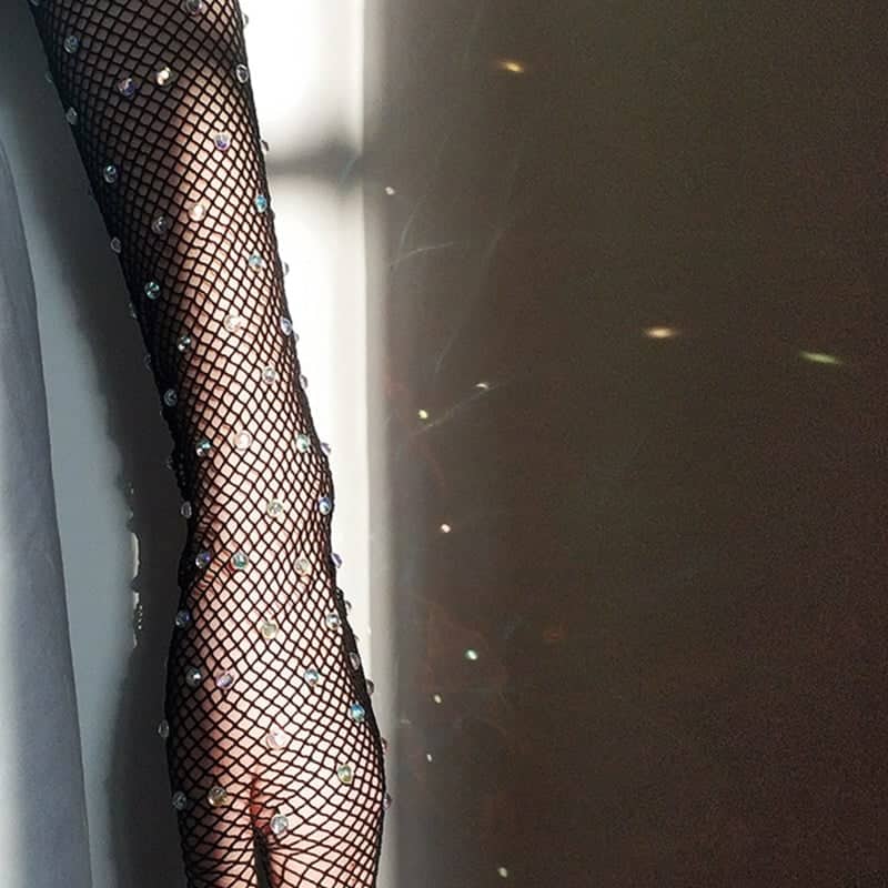 Hoạ tiết: lưới mắt cá, đính hạt đá nhân tạo lấp lánh 7 màu.
