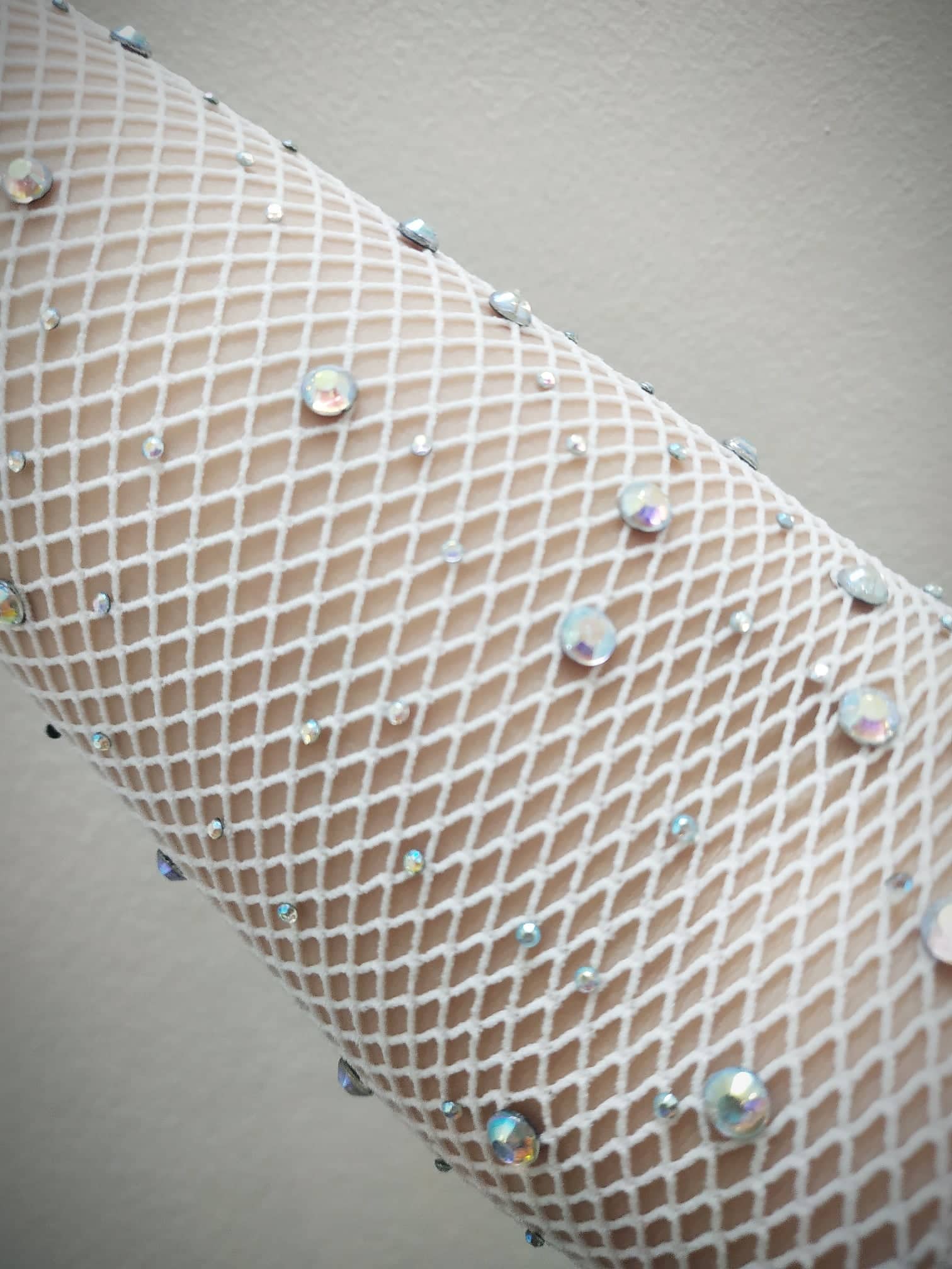 Hoạ tiết: lưới mắt cá, đính hạt đá nhân tạo lấp lánh 7 màu.